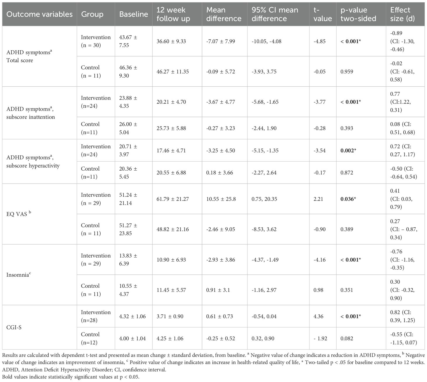In the intervention group, all assessed outcome measures showed significant improvement post-intervention compared to baseline (p < 0.05 in all cases), with medium to large effect on Cohen´s d for ADHD symptom improvement (0.89), insomnia improvement (0.79) and CGI-S improvement (0.82) and small to medium effect (0.41) on improved health related QoL, indicating clinical meaningful improvements. On the other hand, no significant changes were seen in the control group and all effect sizes were small (0.02 to 0.30). ASRS sub scores for inattention and hyperactivity each showed significant improvement in the intervention group. No significant improvements were observed within the control group. Table 4 shows differences in ADHD symptom, health-related QoL, insomnia and CGI-S between baseline and 12 weeks after the start of the intervention for each group.