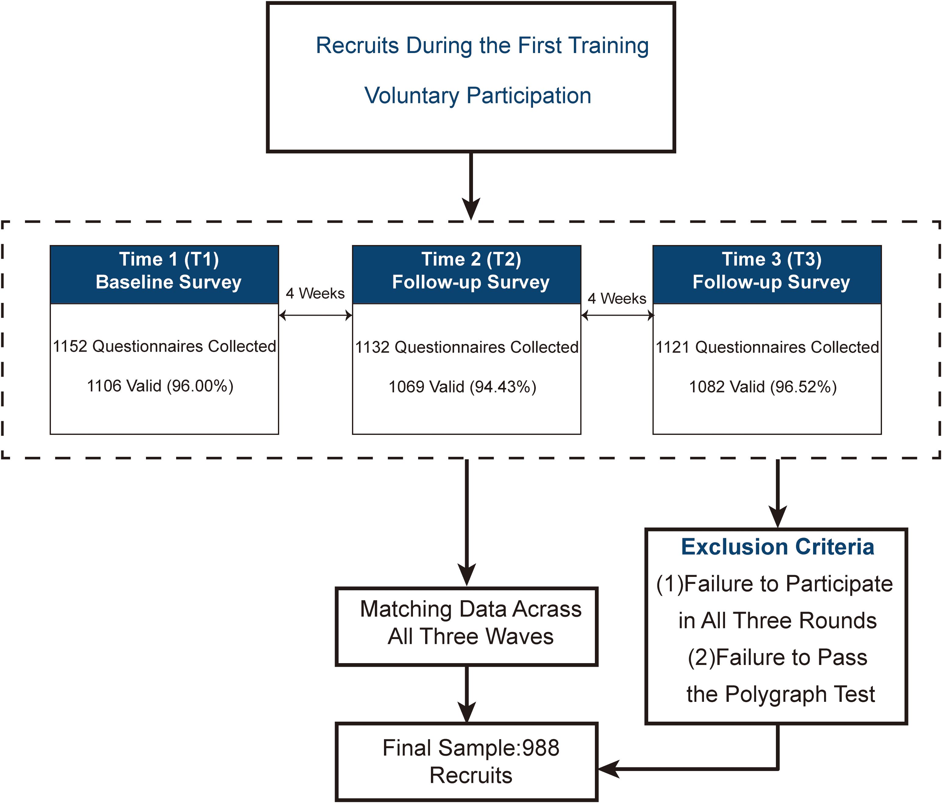 A cluster sampling method was employed, with two companies of newly enlisted recruits from a training base selected as the study sample. A three-wave longitudinal follow-up survey was conducted at 4-week intervals over an 8-week period. The inclusion criteria of the participants were: 1) recruits during the first training period; 2) voluntary participation. Exclusion Criteria were: 1) failure to participate in all three rounds of data collection; 2) failure to pass the polygraph test. At Time 1 (T1), 1,152 questionnaires were collected, of which 1,106 were valid (response rate: 96.00%); at Time 2 (T2), 1,132 were collected, with 1,069 valid responses (response rate: 94.43%); and at Time 3 (T3), 1,121 were collected, with 1,082 valid responses (response rate: 96.52%). After matching data across all three waves, a final sample of 988 recruits (all male) was included in the analysis, detailed baseline data for all samples are provided in Supplementary Table S1. A detailed flowchart of the study could be found in Figure 1. The study was approved by the institutional ethics committee (Approval No. 2020-019-02), and informed consent was obtained from all participants.
