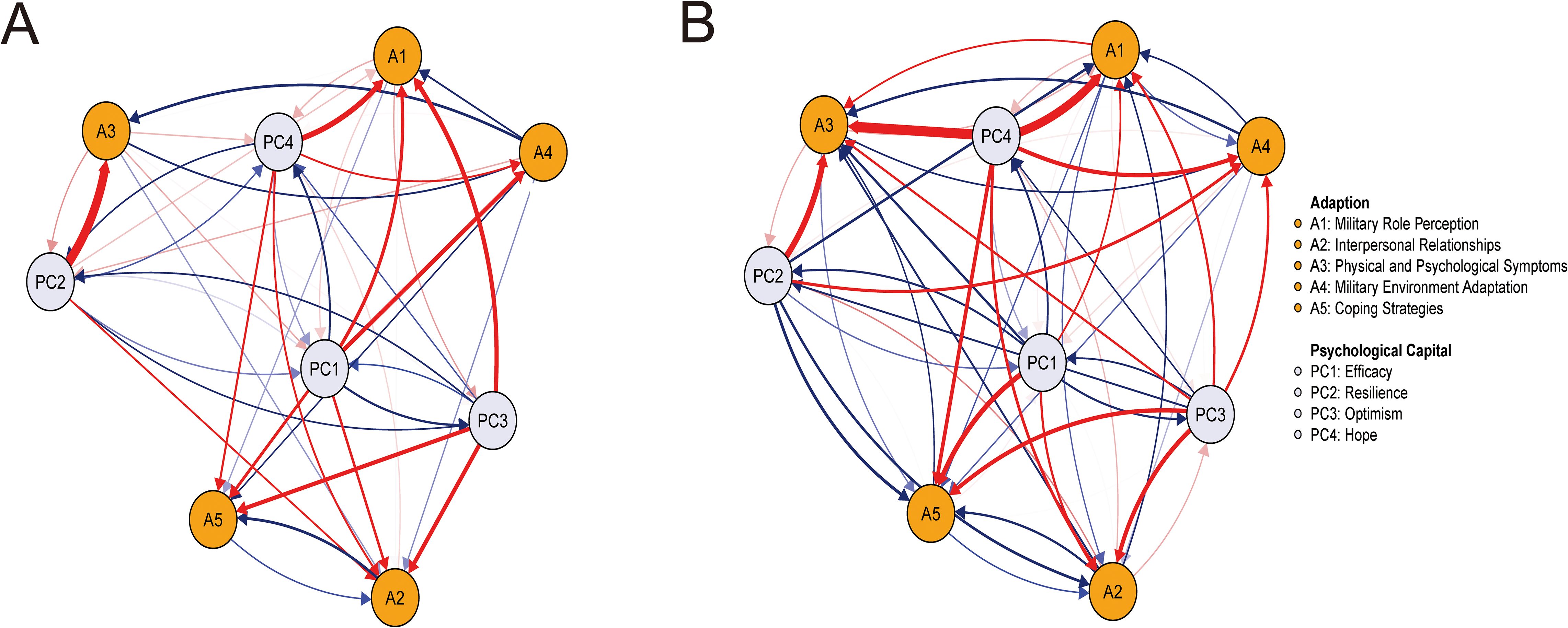 Figure 2. The cross-lagged panel networks for T1→T2 and T2→T3. (A) T1→T2; (B) T2→T3. PC1 = efficacy, PC2 = resilience, PC3 = optimism, PC4 = hope; A1 = military role perception, A2 = interpersonal relationships, A3 = physical and psychological symptoms, A4 = military environment adaptation, A5 = coping strategies. Arrows demonstrate unique longitudinal relationships. Blue edges indicate positive relationships, and red edges indicate negative relationships. Edge thickness reflects connection strength. And auto-regressive effects were constrained to zero to isolate cross-lagged effects.