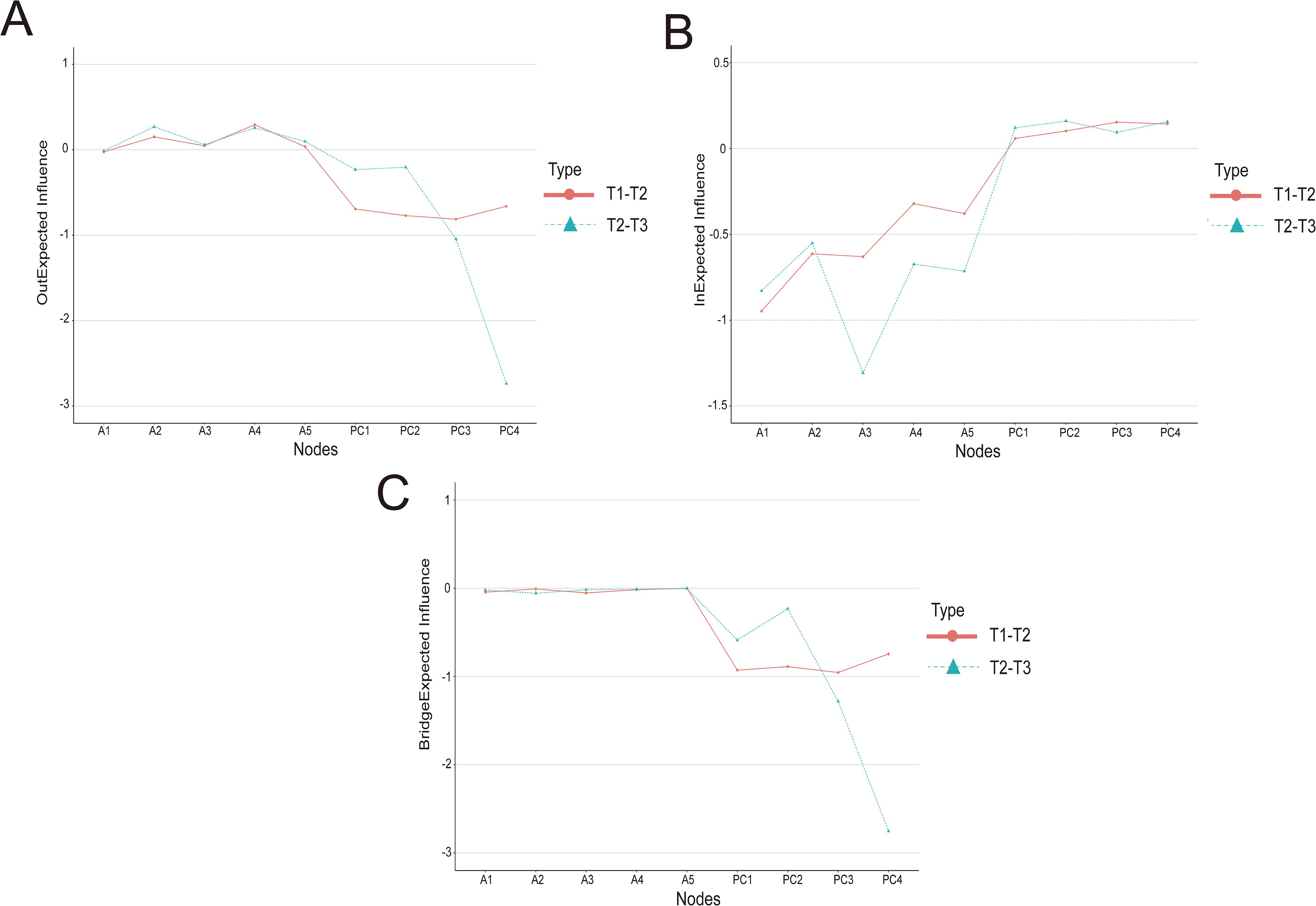 The centrality indices of the cross-lagged network models were shown in Figure 3 (A: out-EI; B: in-EI; C: bridge-EI). In the T1→T2 network, optimism (PC3) had the highest out-EI, followed by resilience (PC2), efficacy (PC1), and hope (PC4). Within adaptation, military role perception (A1) had the highest in-EI, followed by physical and psychological symptoms (A3) and interpersonal relationships (A2). Optimism (PC3) showed the highest bridge-EI. In the T2→T3 network, hope (PC4) and optimism (PC3) both exhibited the highest out-EI. Physical and psychological symptoms (A3) had the highest in-EI, followed by military role perception (A1). Hope (PC4) also had the highest bridge-EI.