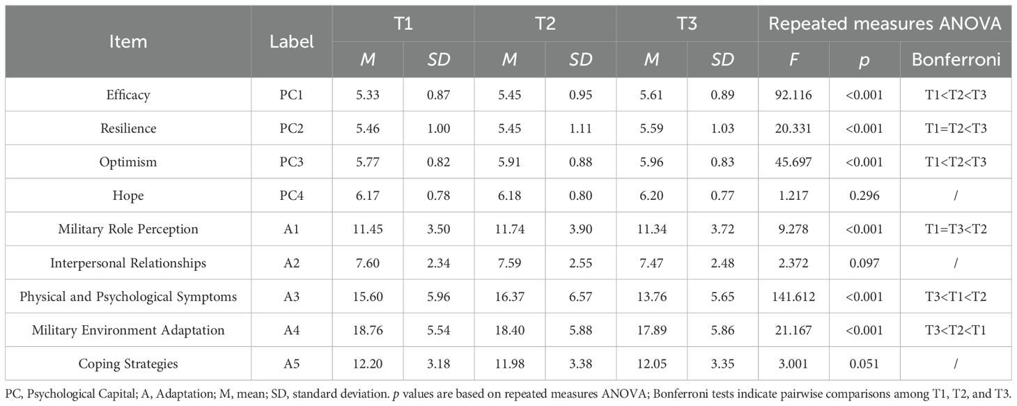 Descriptive statistics were performed using SPSS version 26.0. Means and standard deviations of adaptation and PsyCap dimension scores were calculated, and repeated-measures analyses of variance were performed to preliminarily examine changes across the three time points.