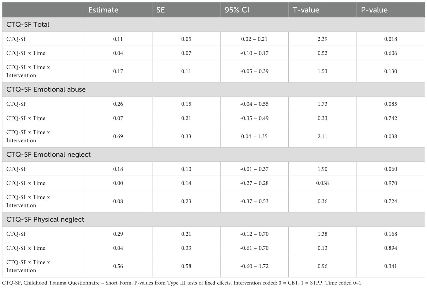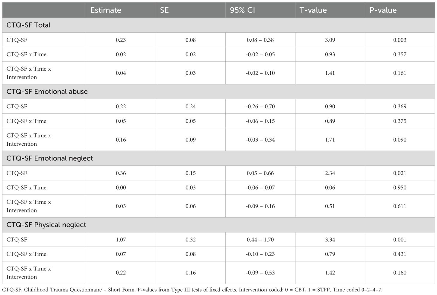 We developed six separate LMMs to address the three research questions (three models × two outcome measures). For readability, results from all models are presented together in a single table for each outcome. In these tables, the CTQ-SF main effect corresponds to research question 1 (baseline severity), the CTQ-SF × Time interaction to question 2 (prediction of outcome), and the CTQ-SF × Time × Intervention interaction to question 3 (moderation of treatment effects).