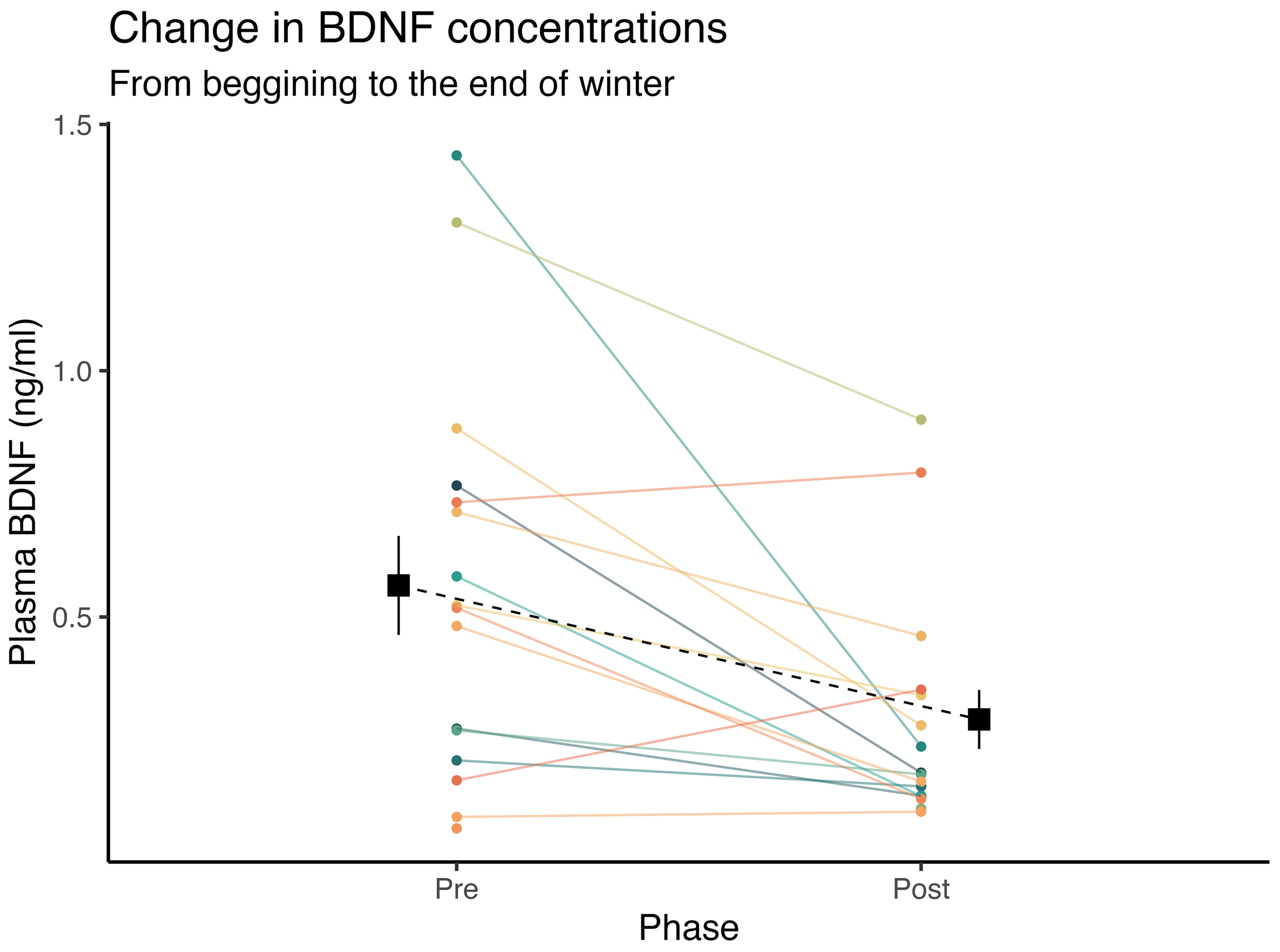 Inter-individual temporal fluctuations in plasmatic BDNF concentrations from the beginning, to the end of winter. Square points and dashed lines represent the mean value, and error bars indicate the standard error of the mean.