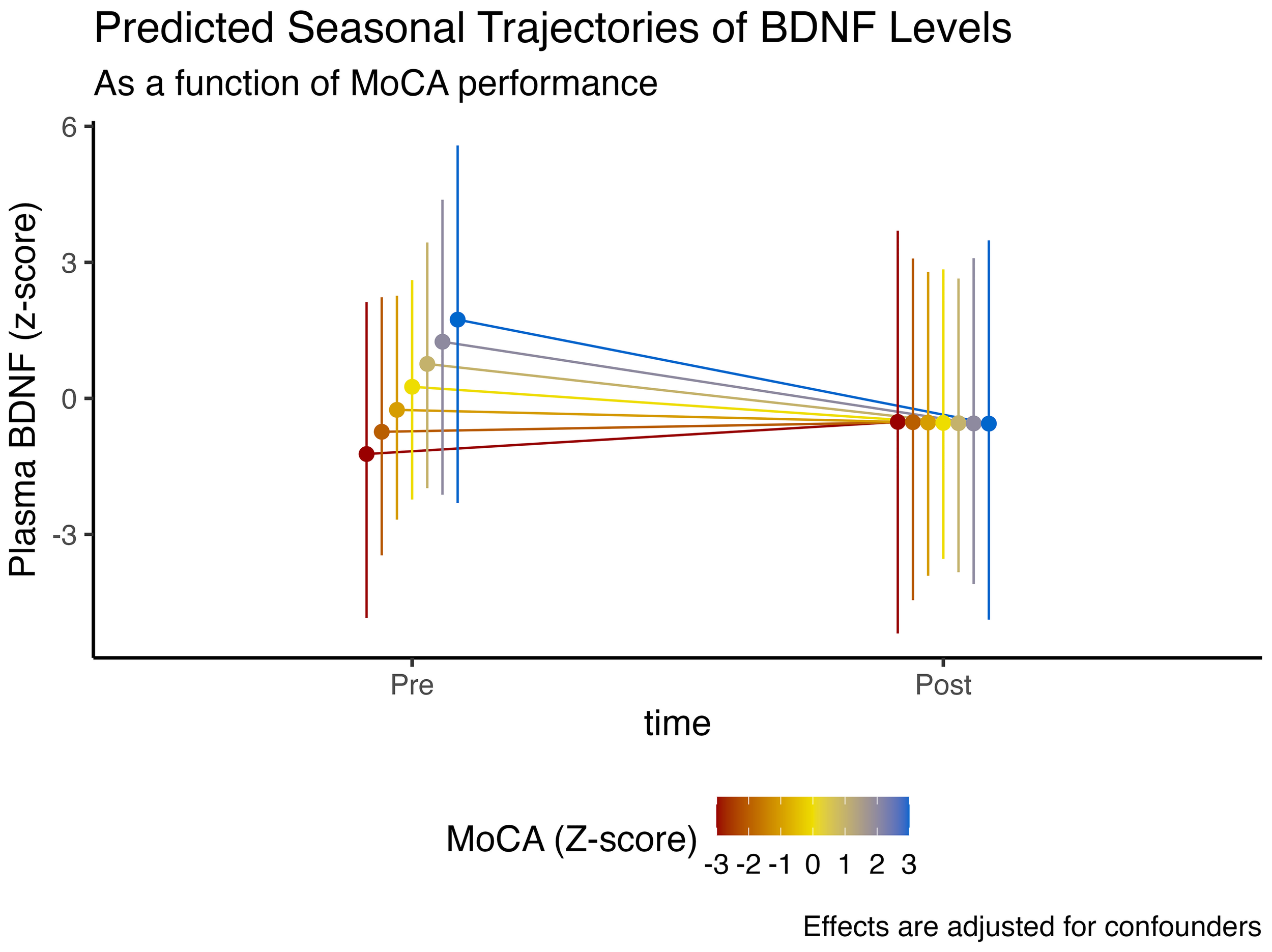 Perhaps the most intriguing and clinically relevant finding of this study is the interaction between baseline cognitive and psychological status on seasonal BDNF trajectories. We observed that individuals with higher cognitive scores (MoCA) and lower anxiety, profiles indicative of better brain health and higher baseline BDNF, demonstrated the steepest decline in BDNF over the winter. Conversely, individuals with higher anxiety, who started with lower BDNF, showed a blunted decline. This suggests that being “healthier” at the outset does not confer immunity to seasonal effects; rather, it may be associated with a greater magnitude of seasonal loss.