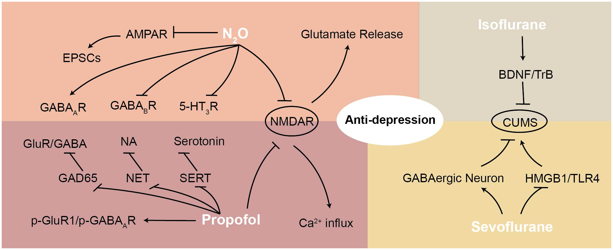 This figure illustrates the mechanisms of various anesthetic agents (N2O, propofol, sevoflurane, and isoflurane) in exerting antidepressant effects, highlighting their interactions with NMDAR and downstream signaling pathways. N2O antagonizes NMDAR and AMPAR, reducing EPSCs and modulating GABA receptors. Propofol enhances GABAergic transmission and regulates p-GluR1/p-GABAAR. Sevoflurane and isoflurane modulate GABAergic neurons and interact with BDNF/TrkB and HMGB1/TLR4 pathways. These mechanisms contribute to anti-depressant effects by restoring synaptic function, regulating neurotransmitter release, and reducing neuroinflammation.