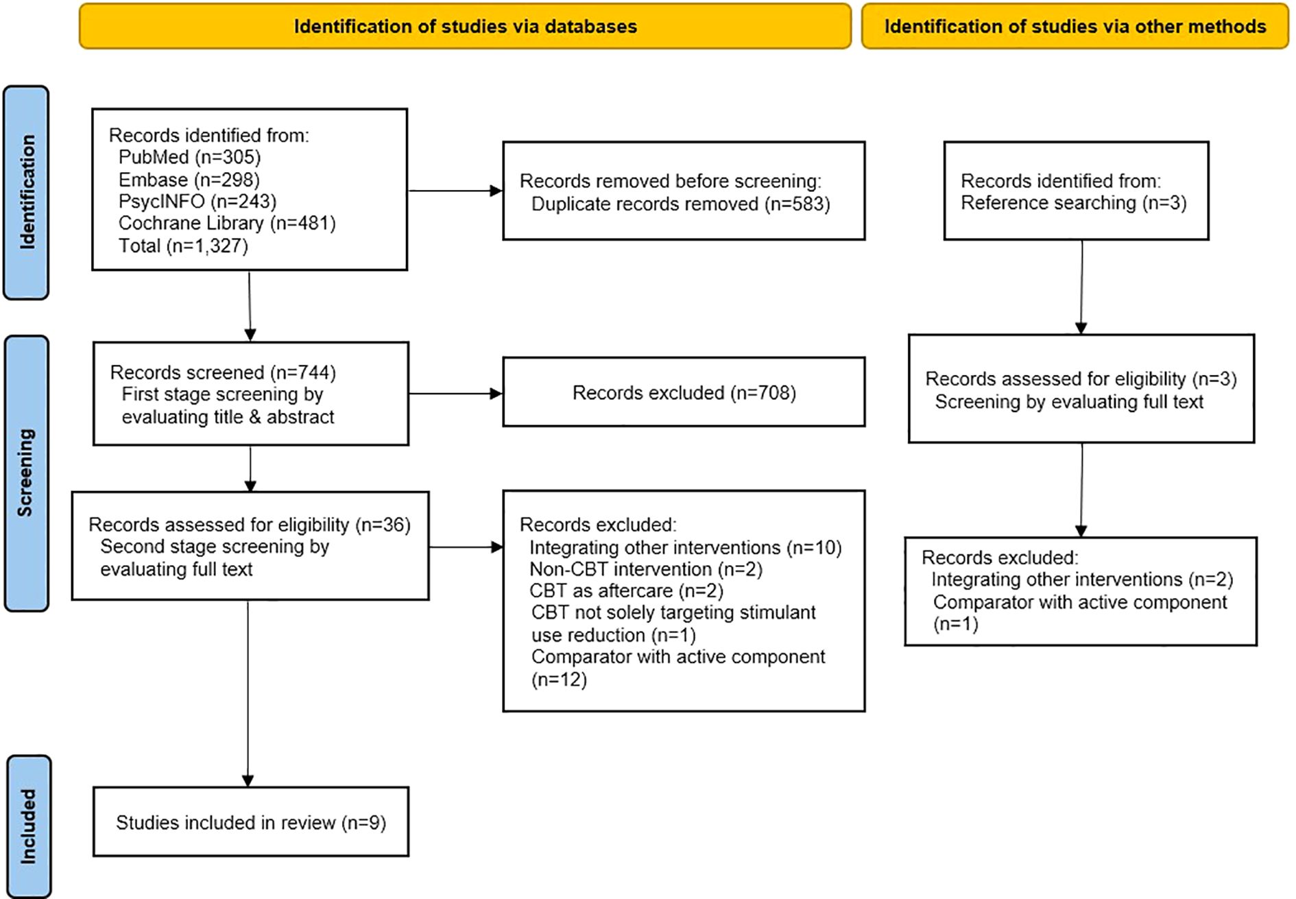 We included studies that assessed CBT as a standalone, structured, manual-based intervention specifically targeting stimulant use. CBT could be delivered individually or in groups, in person or digitally, and added to usual care (e.g., basic counseling or medical management) if no other structured intervention was provided. Trials were eligible if CBT remained the primary focus, with any additional components (e.g., motivational enhancement) limited in scope and duration. We excluded studies that integrated other interventions [e.g., CRA (12) or motivational interviewing (13)] equally with CBT or used CBT solely as aftercare following a different primary treatment (14).
