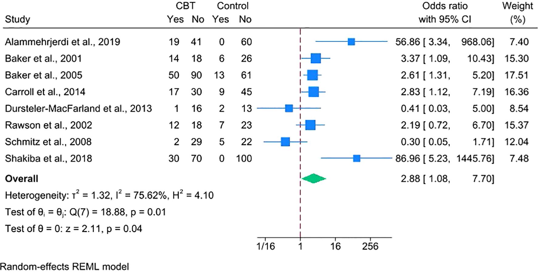 We conducted a meta-analysis of eight RCTs (N = 849; CBT = 457, control = 392), excluding Carroll et al. (26), due to the unavailability of suitable outcome data. The pooled outcome was a dichotomous measure of stimulant abstinence, defined as end-of-treatment or sustained abstinence. Using a random-effects model and ITT approach, CBT was associated with higher odds of stimulant abstinence over short-term follow-ups ranging from 4 to 24 weeks (OR = 2.88, 95% CI = 1.08–7.70, p = 0.04), though heterogeneity was substantial (I² = 75.62%) (Figure 3). While not included in the meta-analysis, Carroll et al. found that computerized CBT significantly increased days of cocaine abstinence. Overall, these findings suggest that standalone CBT increases short-term abstinence relative to minimal treatment.