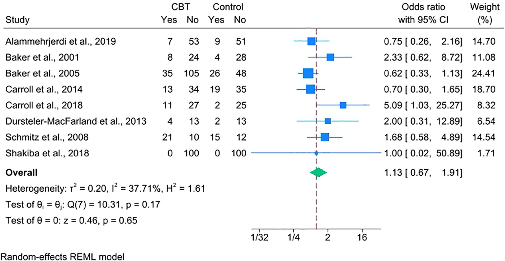 Second, restricting the analysis to the five trials (22–24, 28, 30) that assessed point-prevalence abstinence at treatment completion showed a larger effect (OR = 5.55, 95% CI = 1.72–17.89) (Figure 6), indicating that CBT’s benefit is especially evident at the end of treatment.