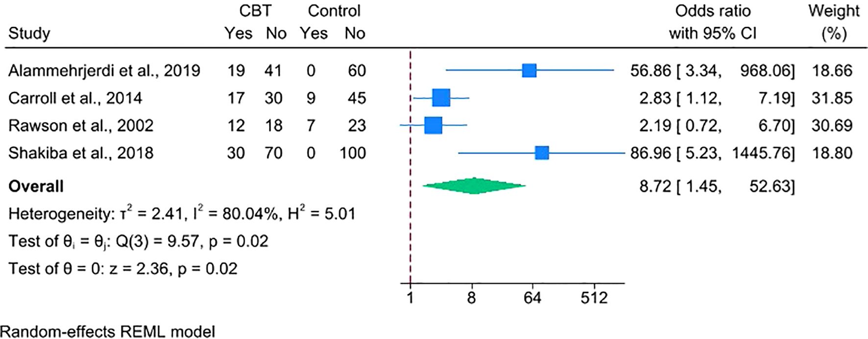 Third, we conducted a RoB-informed analysis that excluded the four trials rated as having an overall high risk of bias. The remaining four comparisons (22, 25, 28, 30) continued to favor CBT (OR = 8.72, 95% CI 1.45–52.63; Figure 7). Heterogeneity persisted at a high level (I² = 80.04%), indicating that the variability was not explained by study-level risk of bias.