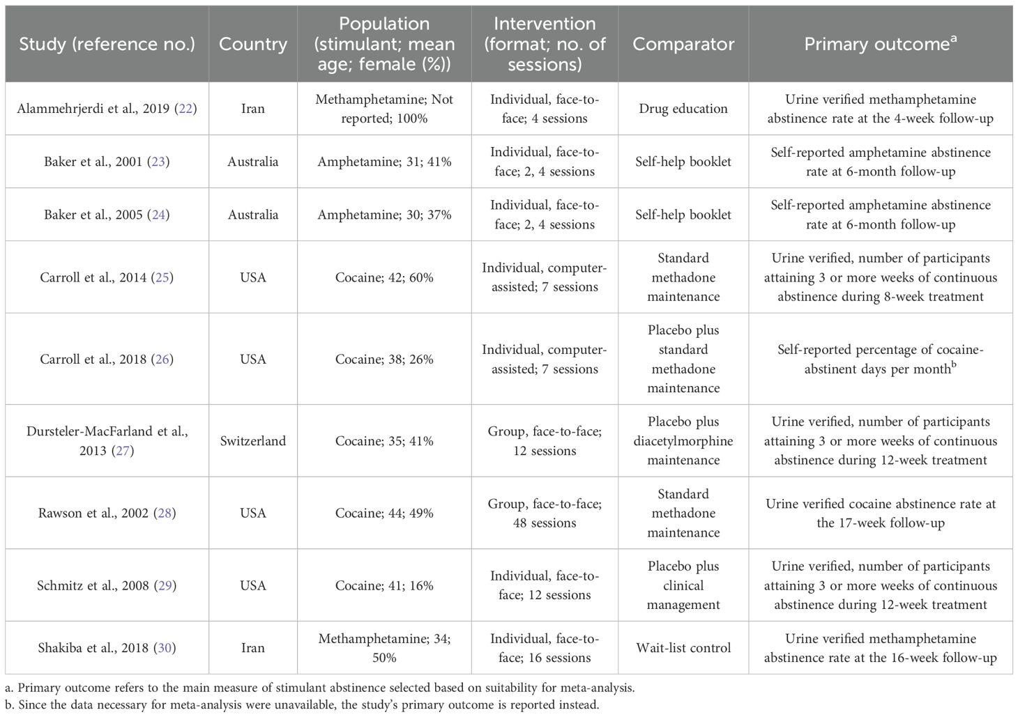 Table 1 summarizes the included studies. Most (7 of 9) were conducted in Western countries. Five studies targeted cocaine, two amphetamine (23, 24), and two methamphetamine (22, 30). All were outpatient trials. Female representation ranged from 16% to 100%, with mean participant ages typically between 30 and 40. CBT was mostly delivered individually (7 studies), face-to-face (7 studies), with two studies using group (27, 28) or computer-assisted formats (25, 26). Session counts ranged from 2 to 48.