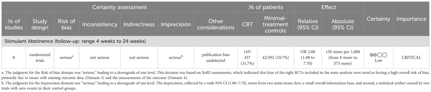 Based on the GRADE framework, the certainty of evidence for the effect of CBT on stimulant abstinence was rated as low (Table 3). This rating was influenced primarily by two concerns: a high risk of bias and serious imprecision.