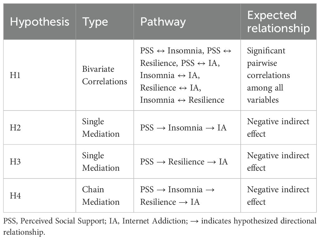 In summary, this study aims to construct a chain mediation model including insomnia (M1) and psychological resilience (M2) to explore the mechanism by which perceived social support (X) affects internet addiction (Y) among flight cadets (Figure 1). The innovation of this study lies in placing sleep and resilience factors in the same model to examine their sequential mediation effects. This not only helps deepen understanding of the causes of internet addiction among flight cadets but also provides multi-level insights for interventions targeting this group: focusing on both the creation of external support environments and attention to sleep management and resilience cultivation, thereby preventing internet addiction comprehensively. Based on existing literature and theoretical analysis, we propose the hypotheses showed in Table 1.