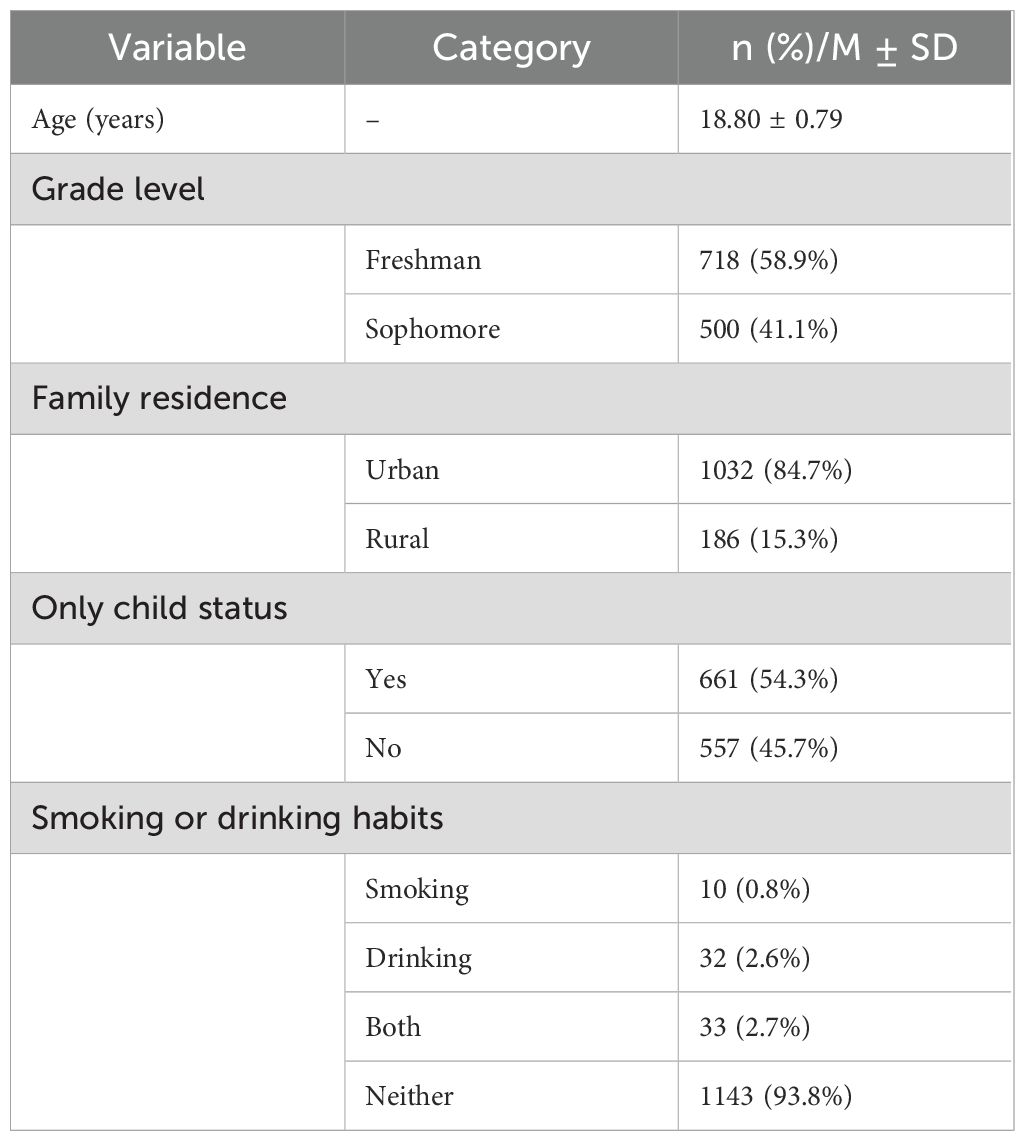 Table 2 summarizes the demographic characteristics of the participants. The 1,218 civil aviation flight cadets had a mean age of 18.80 ± 0.79 years, ranging from 17 to 23 years old. Regarding grade level, 718 participants (58.9%) were freshmen, and 500 (41.1%) were sophomores. In terms of family residence, 1,032 participants (84.7%) were from urban areas, while 186 (15.3%) were from rural areas. Concerning only child status, 661 participants (54.3%) were only children, and 557 (45.7%) had siblings. Regarding smoking or drinking habits, 10 participants (0.8%) reported smoking only, 32 (2.6%) reported drinking only, 33 (2.7%) reported both habits, and 1,143 (93.8%) reported neither smoking nor drinking habits.