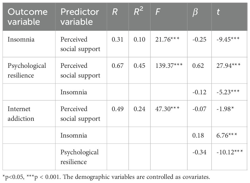 After controlling for background variables such as age, grade, family residence, only child status, smoking history, and drinking history, we conducted regression analysis on the chain mediation model shown in Figure 1, with results listed in Table 4. First, the regression coefficient of perceived social support on insomnia is significantly negative (β = -0.25, t = -9.45, p < 0.001), indicating that the higher the level of social support, the lower the degree of insomnia among flight cadets. Second, in the regression predicting psychological resilience, the effect of perceived social support is significantly positive (β = 0.62, t = 27.94, p < 0.001), and the effect of insomnia is significantly negative (β = -0.12, t = -5.23, p < 0.001). This indicates that the more perceived social support, the stronger the cadets’ psychological resilience; if severe insomnia exists, cadets’ psychological resilience will decrease, meaning insomnia has a significant negative prediction on psychological resilience. Finally, in the regression equation predicting internet addiction, the direct effect of perceived social support is negative and reaches a significant level (β = -0.07, t = -1.98, p < 0.05), indicating that social support still has a direct inhibitory effect on internet addiction after controlling for mediating variables; the effect of insomnia on internet addiction is positive and significant (β = 0.18, t = 6.76, p < 0.001), and the effect of psychological resilience is negative and significant (β = -0.34, t = -10.12, p < 0.001). This indicates that when considering social support and psychological resilience simultaneously, higher insomnia severity significantly increases internet addiction risk, while higher psychological resilience significantly reduces internet addiction tendencies. The above regression results indicate that the effect of perceived social support on internet addiction has both direct paths and is indirectly realized through insomnia and psychological resilience.