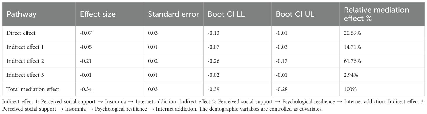 Table 3 presents the means, standard deviations, and correlation coefficients between variables. Results show that all variables are significantly correlated with each other (p < 0.01). Specifically, perceived social support is significantly negatively correlated with internet addiction (r = -0.34), indicating that the more social support received, the lower the degree of internet addiction. Perceived social support is significantly negatively correlated with insomnia (r = -0.26), suggesting that cadets with high social support have fewer insomnia symptoms. Perceived social support is significantly positively correlated with psychological resilience (r = 0.65), meaning cadets with stronger perceived support have higher psychological resilience. Insomnia is significantly positively correlated with internet addiction (r = 0.30), indicating that cadets with severe insomnia are more likely to develop internet addiction tendencies. Psychological resilience is significantly negatively correlated with internet addiction (r = -0.44), meaning populations with high psychological resilience have lower internet addiction risk. Additionally, insomnia is significantly negatively correlated with psychological resilience (r = -0.28), suggesting that poor sleep may damage an individual’s psychological resilience. These correlation results support our hypothetical premises: social support, sleep, psychological resilience, and internet addiction are closely related, satisfying the conditions for conducting multiple mediation analysis.