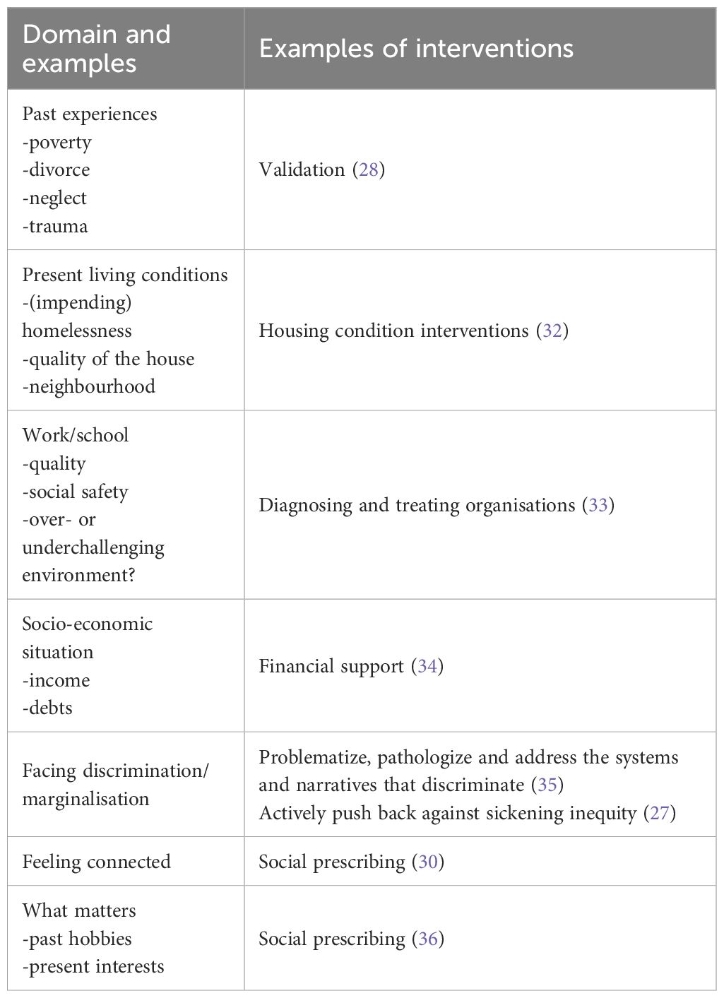 Context diagnosis explores the broad life context in which distress occurs. This includes a detailed contextual anamnesis, assessing aspects such as living conditions, work or educational setting, socio-economic situation, social relationships, life transitions, sources of stress, etcetera. In addition to this, the question “What matters to you” may open the door to holistic health solutions (30). The related social prescribing is an emerging contextual approach to addressing mental health challenges, involving explicitly non-medical referrals such as community groups and activities like community gardening, choirs, reading clubs, walking groups, and volunteering (31). Table 1 offers a preliminary overview of some areas for contextual diagnostics, to be expanded in the future.