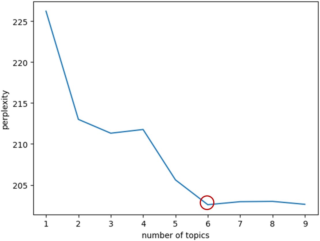 Topic modeling is an effective method for identifying and organizing latent themes within large-scale text data (28). Among these methods, Latent Dirichlet Allocation (LDA) assumes that each document is composed of multiple latent topics, and each topic is characterized by a distinct word distribution (29). A key challenge in applying LDA lies in determining the optimal number of topics (30). An excessive number of topics may cause overfitting, whereas too few topics may oversimplify the text and obscure meaningful distinctions (31)To address this issue, the present study employed a perplexity-based optimization procedure, where lower perplexity values indicate a better-fitting model (32–34). The calculation of perplexity is shown in Equation 1.