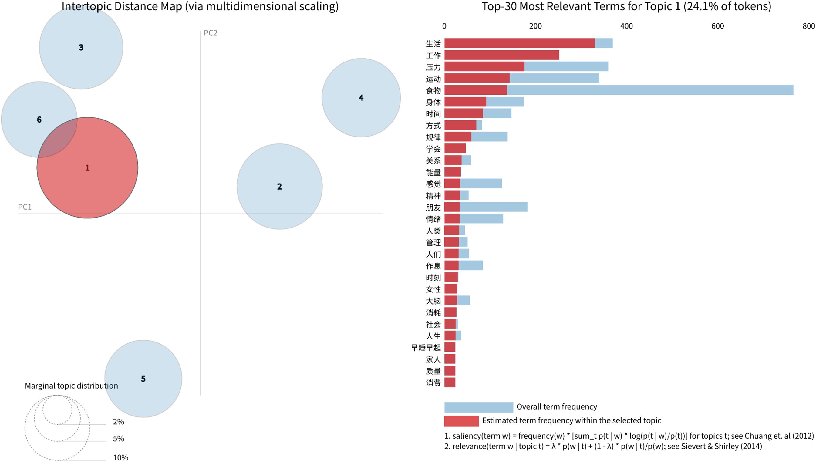 Multidimensional Scaling (MDS) analysis, implemented via the pyLDAvis package, visually represents the inter-topic relationships (44). The visualization of topic spatial distributions is depicted in Figure 4, where bubble labels correspond to topic indices, and bubble diameter scales proportionally to the document count within each topic. Taking Topic 1 as an exemplar, the right panel of Figure 4 displays the 30 most relevant terms for this topic, along with their proportional representation among all tokens (24.1%). (Detailed visualizations for other topics are provided in Supplementary Material 1) Inter-bubble distances reflect semantic associations between topics: proximate bubbles indicate thematic overlaps, while distant ones suggest content independence.