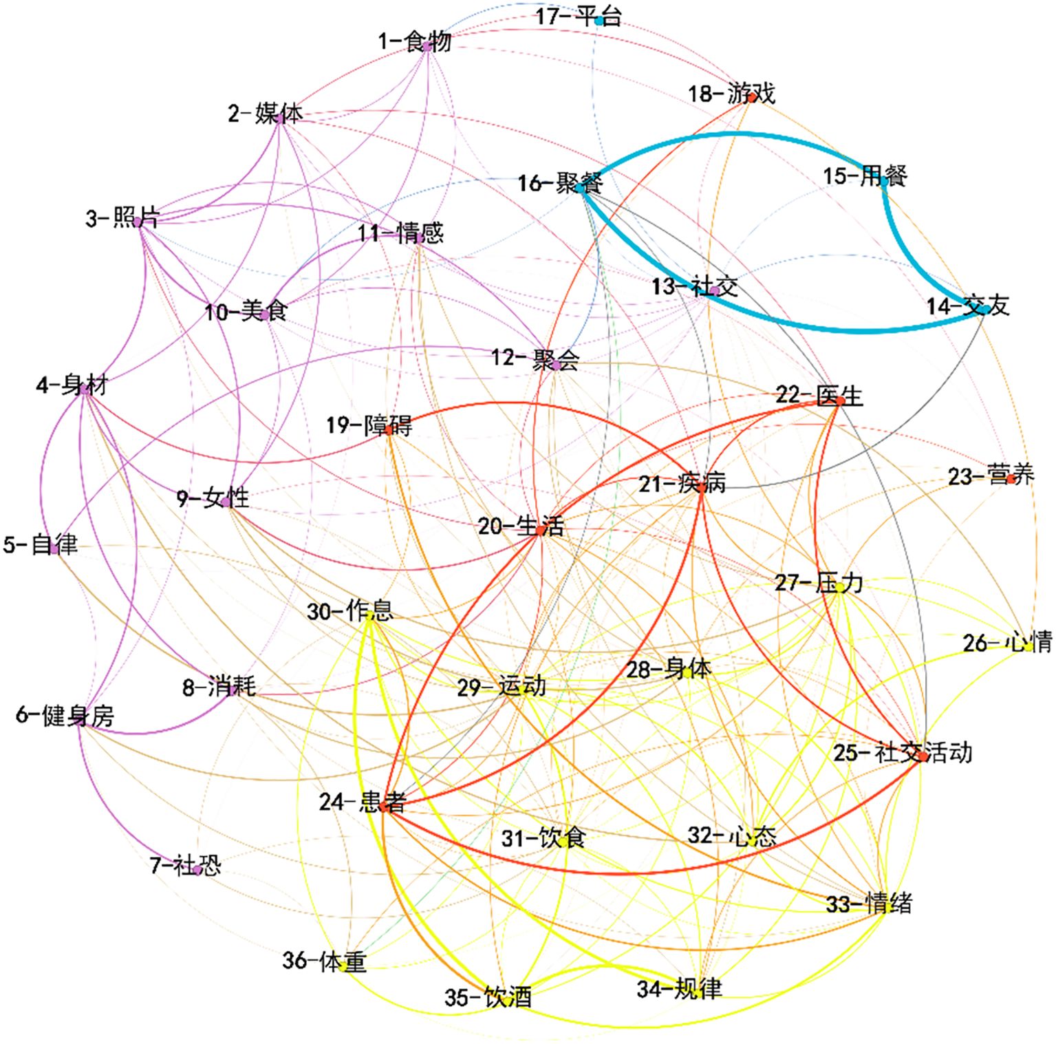 Figure 5. Semantic network analysis of Weibo discussions related to social and dietary themes. The nodes in the picture are as follows: 1 - Food, 2 - Media, 3 - Photo, 4 - Body figure, 5 - Self - discipline, 6 - Gym, 7 - Social phobia, 8 - Consumption, 9 - Female, 10 - Delicacy, 11 - Emotion, 12 - Gathering, 13 - Social interaction, 14 - Make friends, 15 - Dine, 16 - Dinner party, 17 - Platform, 18 - Game, 19 - Obstacle, 20 - Life, 21 - Disease, 22 - Doctor, 23 - Nutrition, 24 - Patient, 25 - Social activity, 26 - Mood, 27 - Stress, 28 - Body, 29 - Exercise, 30 - Work and rest schedule, 31 - Diet, 32 - Mentality, 33 - Emotion, 34 - Regularity, 35 - Drink alcohol, 36 - Weight.