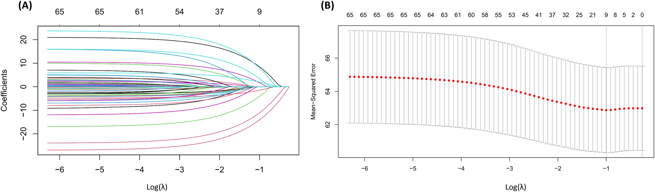 Figure 6. Visualization of the effects of log(λ) on LASSO regression. (A) LASSO regression coefficients. (B) Mean squared error (MSE) across different λ values.