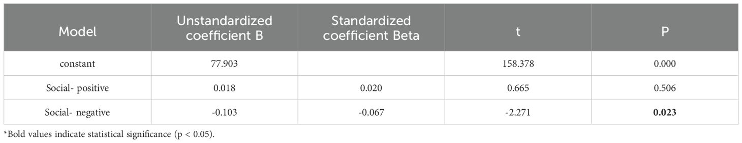 Building upon the thematic and semantic findings in Study 1, Study 2 further explored how social-emotional expressions in interpersonal contexts relate to individual eating behaviors. Based on social text data from 1,199 valid participants, the study first quantified emotional indicators through sentiment analysis and conducted multiple linear regression analyses using the LIWC emotion scores and the total score of the Intuitive Eating Scale-2 (IES-2). As shown in Table 2, the negative emotion score in social texts was significantly negatively associated with intuitive eating behaviors (β = -0.103, p = 0.023), indicating that individuals who express stronger negative emotions in social interactions are more likely to experience impaired intuitive eating abilities.