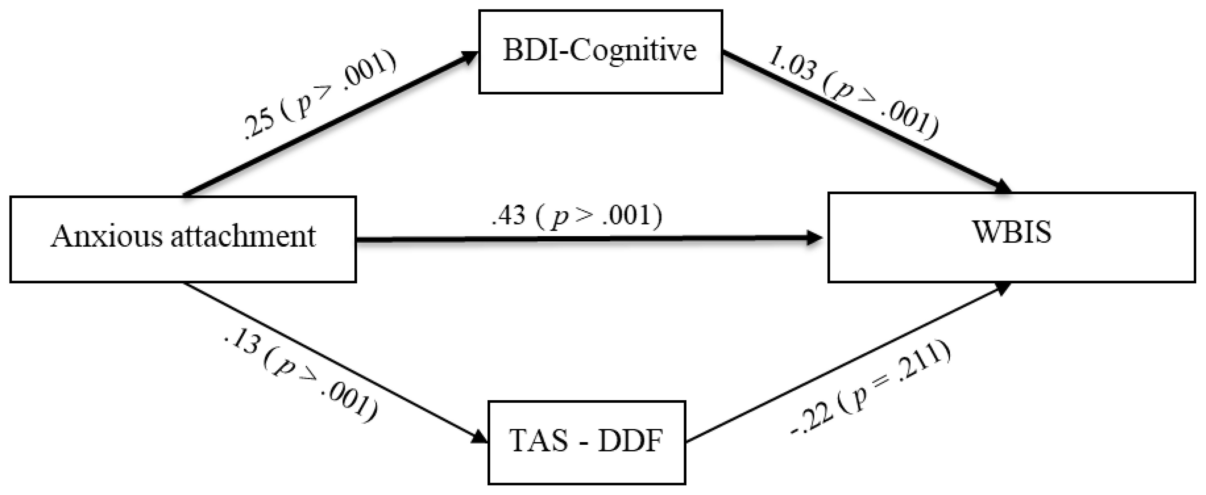 These results suggest that cognitive symptoms of depression partially mediated the relationship between anxious attachment and IWB. In contrast, difficulty describing feelings did not play a significant mediating role.