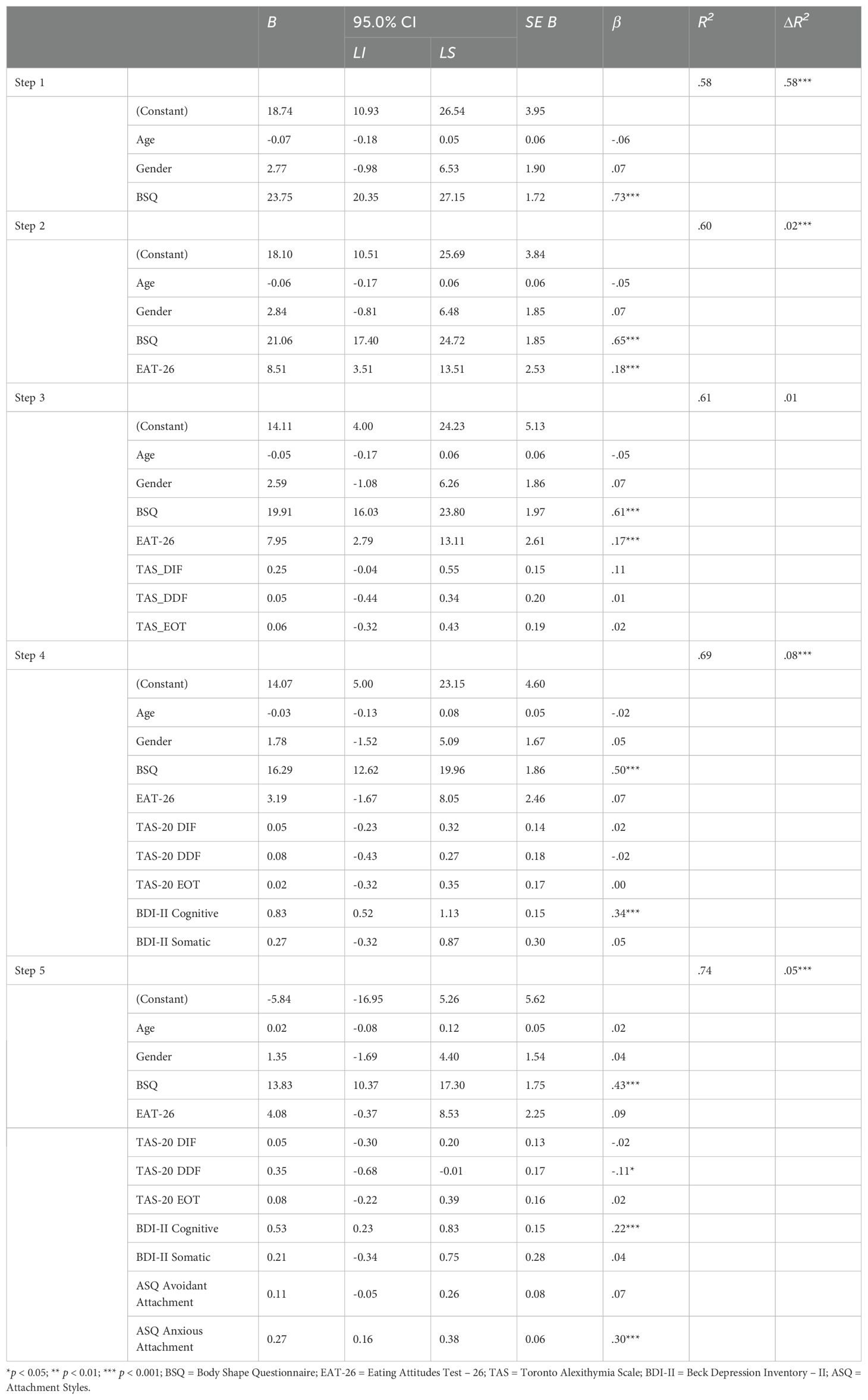 We performed a hierarchical multiple regression analysis to investigate potential factors influencing weight bias. Multivariate outliers were detected using Mahalanobis Distance (D²), applying the criterion where cases with a D² value exceeding the threshold of 26.13 (i.e., D² value at p < 0.05, with 8 degrees of freedom) (48) were considered outliers. The sequence of independent variables in the hierarchical regressions was determined based on the study’s objectives and theoretical rationale. The first step involved covariates, including sex, age, and BSQ dichotomized (0= no or mild concern with shape; 1= moderate-to-marked concern with shape). In the second step, variables indicating the presence or risk of eating disorders were entered as dichotomous predictors (0 = below cut-off; 1 = above cut-off). Specifically, the EAT-26 (cut-off ≥ 20) was used to identify individuals at risk of eating disorders. The third step included alexithymia, as measured by TAS-20, while in the fourth step, depressive symptoms, both cognitive and somatic dimensions, were entered in the model. Finally, in the fifth step, the anxious and avoidant attachment styles, assessed through the ASQ, were included in the model.