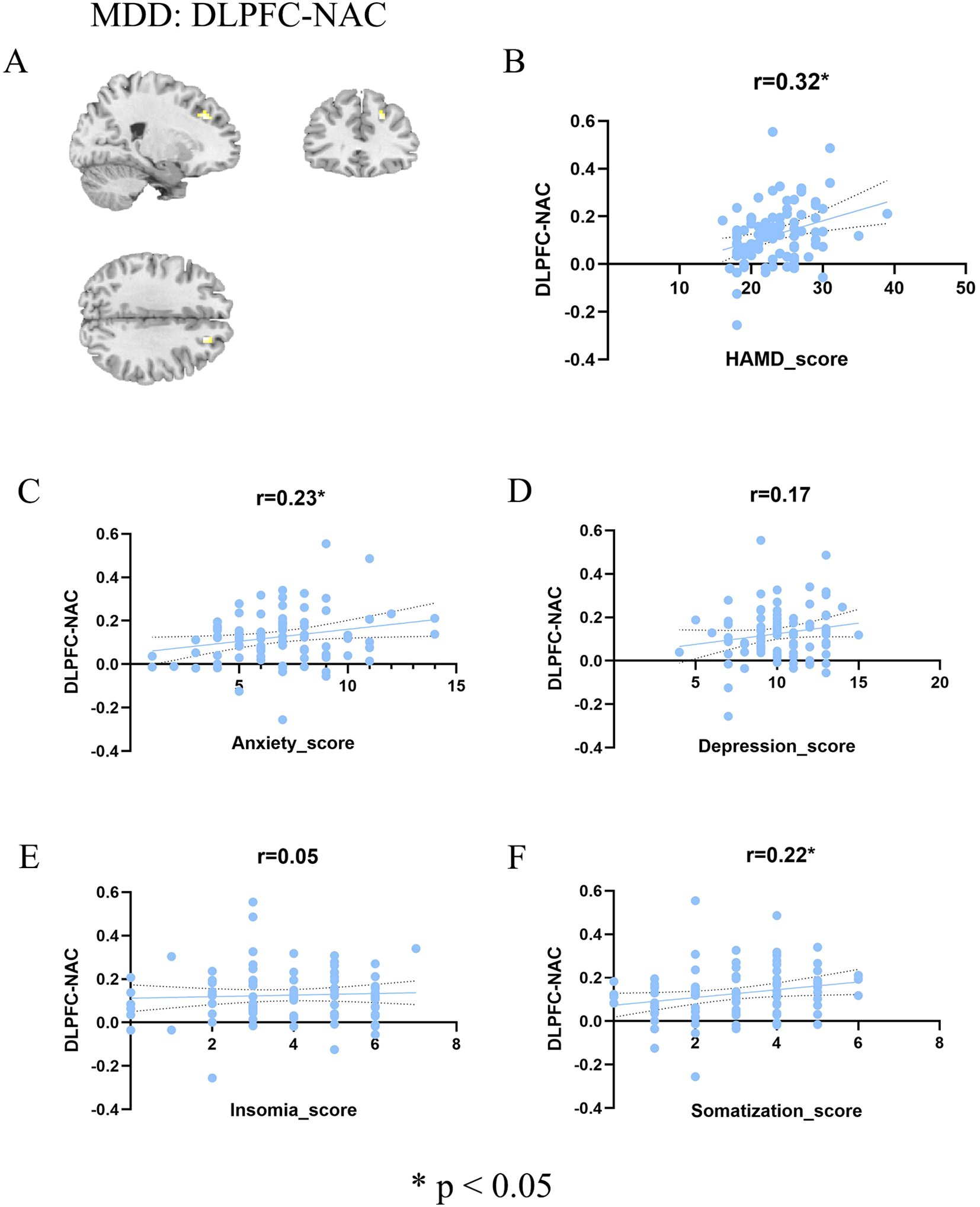 In summary, this study demonstrated that patients with MDD exhibit significantly enhanced DLPFC-NAc functional connectivity compared to healthy controls. Notably, this alteration was positively correlated with the anxiety and somatization factors of the HAMD but showed no association with depressive core symptoms or insomnia. These findings highlight the symptom-dimension specificity of DLPFC-NAc connectivity, suggesting that abnormalities in this pathway may be particularly relevant to anxiety- and somatization-related processes in MDD. Beyond enriching the multidimensional network model of depression, our results also point to DLPFC-NAc connectivity as a promising neural target for individualized interventions. Future studies with larger samples, longitudinal designs, and advanced modeling approaches are warranted to clarify the dynamic role of this circuit in the pathophysiology of MDD.