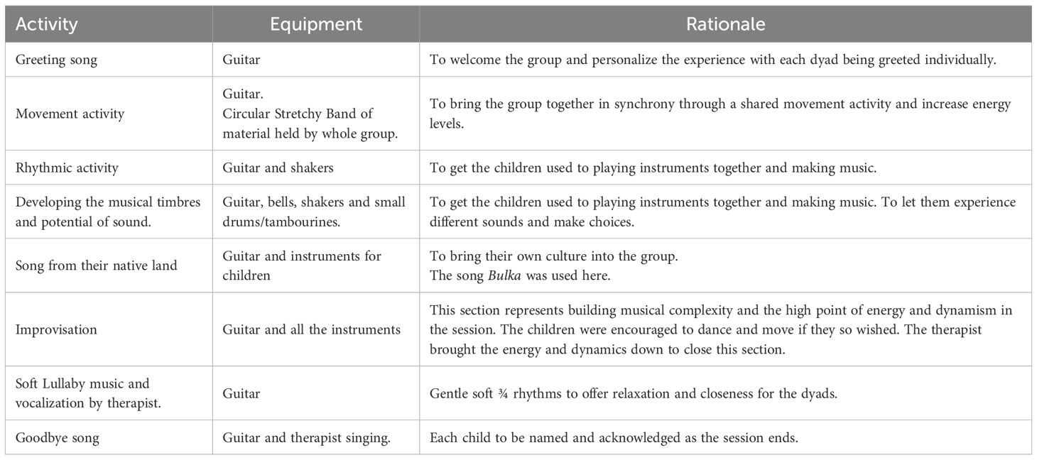 The MT comprised of eight weekly sessions of in-person group MT, each lasting 45–60 minutes. These sessions were delivered by a MA student on a MT course at a UK University, who had prior experience working with displaced families during a clinical placement or an HCPC registered music therapist. In-person sessions took place at a central London location and the study involved four groups of four or six caregiver-child pairs. Drawing on previous experience with similar populations (87, 100), the second author developed the current protocol (Table 1). The protocol was informed by the work of 101; 102, who describe using musical activities in classroom settings to support children’s emotional regulation. These activities are designed to incorporate different musical elements — such as loud, soft, fast, and slow — in a structured and intentional way. The protocol was further tailored to be culturally meaningful and representative of the groups, with caregivers actively invited to contribute songs/lullabies to the co-design process. This collaborative approach aimed to enhance parents’ self-efficacy and parenting skills in a manner aligned with their values and belief systems. We also considered to what extent Western practices of group singing and music-making resonate with Ukrainian cultural traditions, and whether these could help displaced caregivers feel safe and authentic. To avoid triggering material, parents were encouraged to identify culturally meaningful songs from their own early childhood musical experiences. These would by their very nature have a repetitive structure with short phrases and a simple melodic line. As a result, all parents agreed that the Ukrainian song ‘Bulka’ was most appropriate and was, thus, included in the protocol as a central feature. It was positioned just before the improvisation section, the session’s highest point of energy, where use of instruments were also encouraged as a means of further emotional expression. Each session began with a greeting song in which mothers were encouraged to pronounce their child’s name in its original Ukrainian form, with the group joining in to sing each name (an element highly valued by caregivers in post-interviews; see 103) as a symbol of cultural recognition and social integration, essential to those who are separated from their country and community. The music therapist consistently followed the structure outlined in Table 1 engaging caregivers in musical activities while responding sensitively to children’s contributions, maintaining curiosity and genuine interest in participants cultural backgrounds and musical responses. Therapist responses were shaped according to these musical offerings which grew from the caregivers’ own early musical experiences. Caregivers’ responses to the music were validated and supported by the therapist as “an intercultural meeting beyond words” (104, p. 85) with music acting as a vehicle toward hope and empowerment (105, 106). A variety of musical instruments were used, from guitar and keyboard to smaller handheld items such as shaker, bells and maracas, which were suitable for small hands. All were sanitised before and after each use.