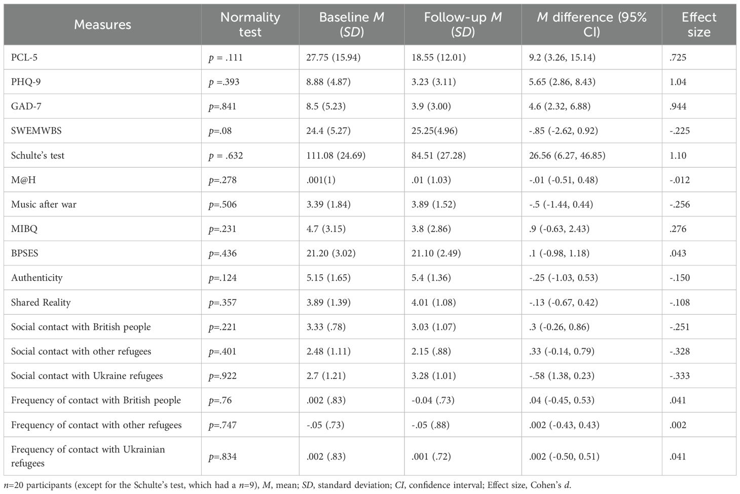 Quantitative analyses were conducted in Statistical Package for the Social Sciences (SPSS, version 28). All mental health and parenting scales were treated as continuous measures by summing responses across all items for each individual scale. For the music scales, we created an overall measure of the M@H questionnaire by averaging all item responses for each individual version (infant vs. preschool) separately; scores were then z-transformed to account for the different number of items used in the two versions. We also created separate mean scores for the two items measuring family active engagement with music, the two items assessing authenticity, and the four items evaluating shared reality. For the social contact measures, we calculated composite social contact scales by averaging the two items for each group (i.e., British, other refugees and Ukrainian refugees). Similarly, for the two items measuring frequency of social contact, we calculated separate average scores for each group. Next, we analysed data as per the general guidelines, by testing for the normality assumption (i.e., Shapiro-Wilk test), which is particularly relevant for small sample sizes (Table 2). We thus, computed the differences between the baseline and post-MT intervention measurements and given the normal distribution of all data, paired sample t-tests were carried out and effect size calculations were also considered. To note that for the GAD-7, PHQ-9, PCL-5, Schulte’s test and MIBQ, higher scores reflect greater symptom severity or difficulties in the respective constructs, whereas for all other measures, higher scores indicated more favourable outcomes.