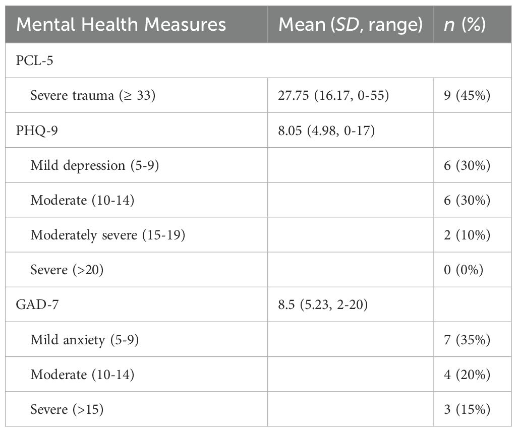 Table 3 displays participants’ baseline characteristics. Some were single parents displaced in the UK (33%, n=7) with a high prevalence of mental health issues: 45% (n = 9) experienced previous trauma and loss-related PTSD (scores ≥ 33, the cutoff indicating probable PTSD; 126), 35% (n = 7) reported anxiety (scores ≥ 10, the validated cutoff in non-clinical settings; 127), and 40% (n = 8) reported depressive symptoms (scores ≥ 10, established cutoff in non-clinical settings; 128).