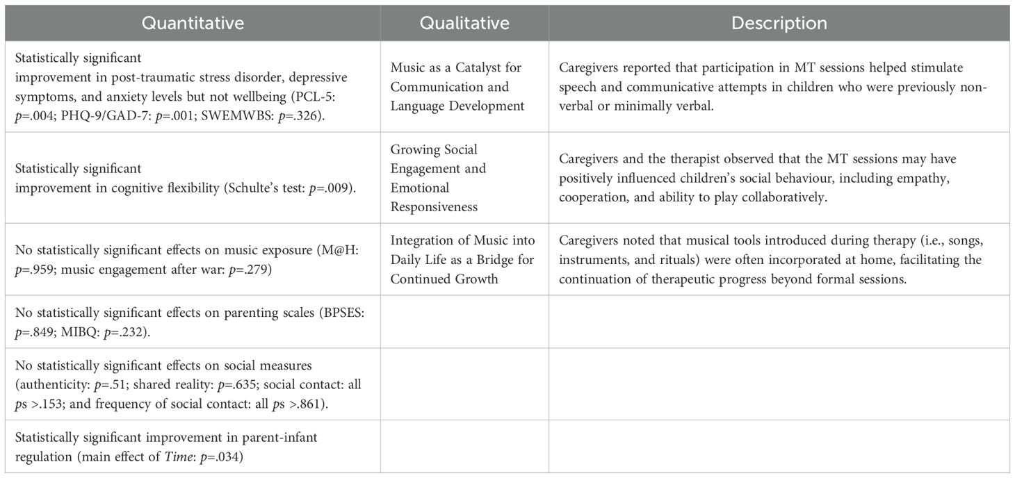 In Table 4 we align the quantitative and qualitative findings to provide a more comprehensive overview of the results. Consistent with the convergent mixed-methods design, quantitative and qualitative data were analysed separately but integrated during the final stage of reporting and interpretation to generate insights that either approach might not reveal on its own. This positions the study within an explanatory unidirectional framework for convergent design integration (132). Quantitative findings are complemented by corresponding qualitative themes, which enrich understanding and add depth. The qualitative data gives voice to caregivers’ experiences, offering perspectives on children’s developmental progress and a more holistic view of MT’s effects on both caregivers and children. For instance, although BPSES scores did not reach the threshold for statistical significance, caregivers reported that music became embedded in family routines and may have indirectly supported their parenting practices.