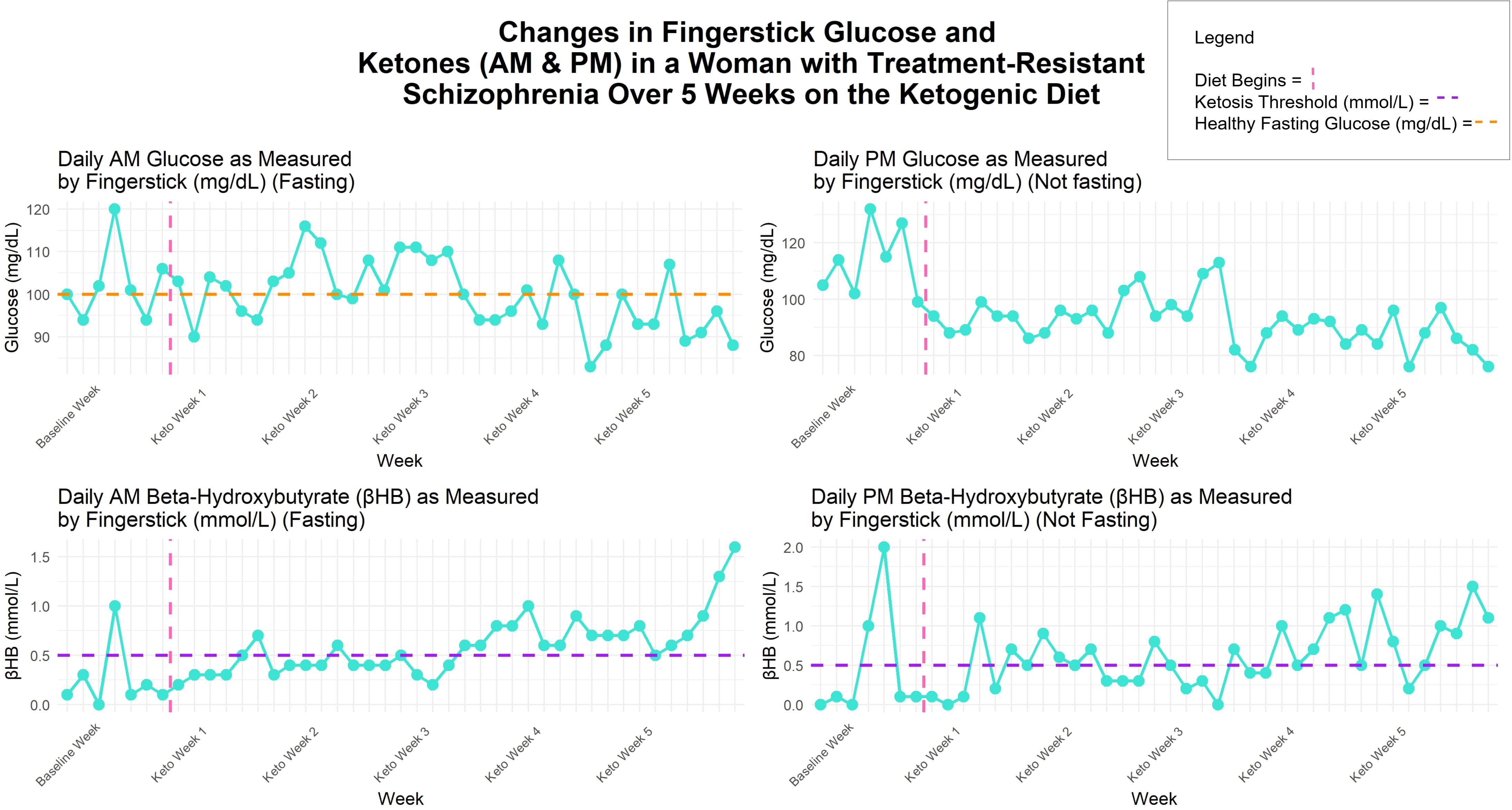 The participant began struggling with mental illness at age 18 and first experienced psychotic symptoms at age 21. During the 27 years since her first psychotic episode, her symptoms were unresponsive to several antipsychotic medications including haloperidol, risperidone, and aripiprazole, and only partially responsive to olanzapine before adding clozapine for her TRS. She had numerous prior hospitalizations and had been an inpatient for over 2 years prior to participation in this study. Additionally, she suffered from long-term unresponsive negative symptoms. She had a history of medication-induced type 2 diabetes and a metabolic syndrome diagnosis at KD initiation. She was also taking divalproex sodium (mood stabilization) (21 months), metformin (metabolic syndrome) (6 months), amlodipine (hypertension) (5 months), oxybutynin (enuresis) (3 months), propranolol (akathisia) (3 months), and a multivitamin, which was started alongside KD. Pro re nata (PRN) medications included lorazepam (akathisia, agitation, anxiety, insomnia), milk of magnesia (constipation), and acetaminophen (menstrual cramps). About 6 months prior to the study, a slow and cautious clozapine trial was initiated, given her limited response to olanzapine, which she had been on for 20 months before study initiation. When beginning clozapine, olanzapine was unable to be successfully tapered, despite slow and deliberate attempts, without worsening mood, disorganization, and psychosis. Thus, both clozapine and olanzapine were maintained. No antipsychotic changes occurred during the 5 weeks on KD to prevent introducing medication confounds. The only medication changes noted during the study were the addition of ipratropium bromide (sialorrhea) at the end of week 2, and ferrous sulphate (anemia) at week 5. Both were continued through the end of the study.