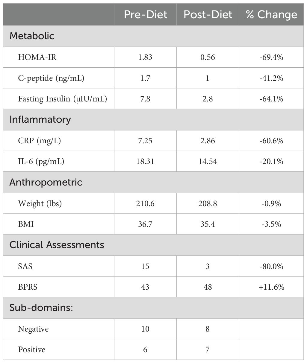 Table 1. Pre- and post-diet outcomes in a woman with treatment-resistant schizophrenia and metabolic syndrome after a ketogenic diet for 5-weeks.