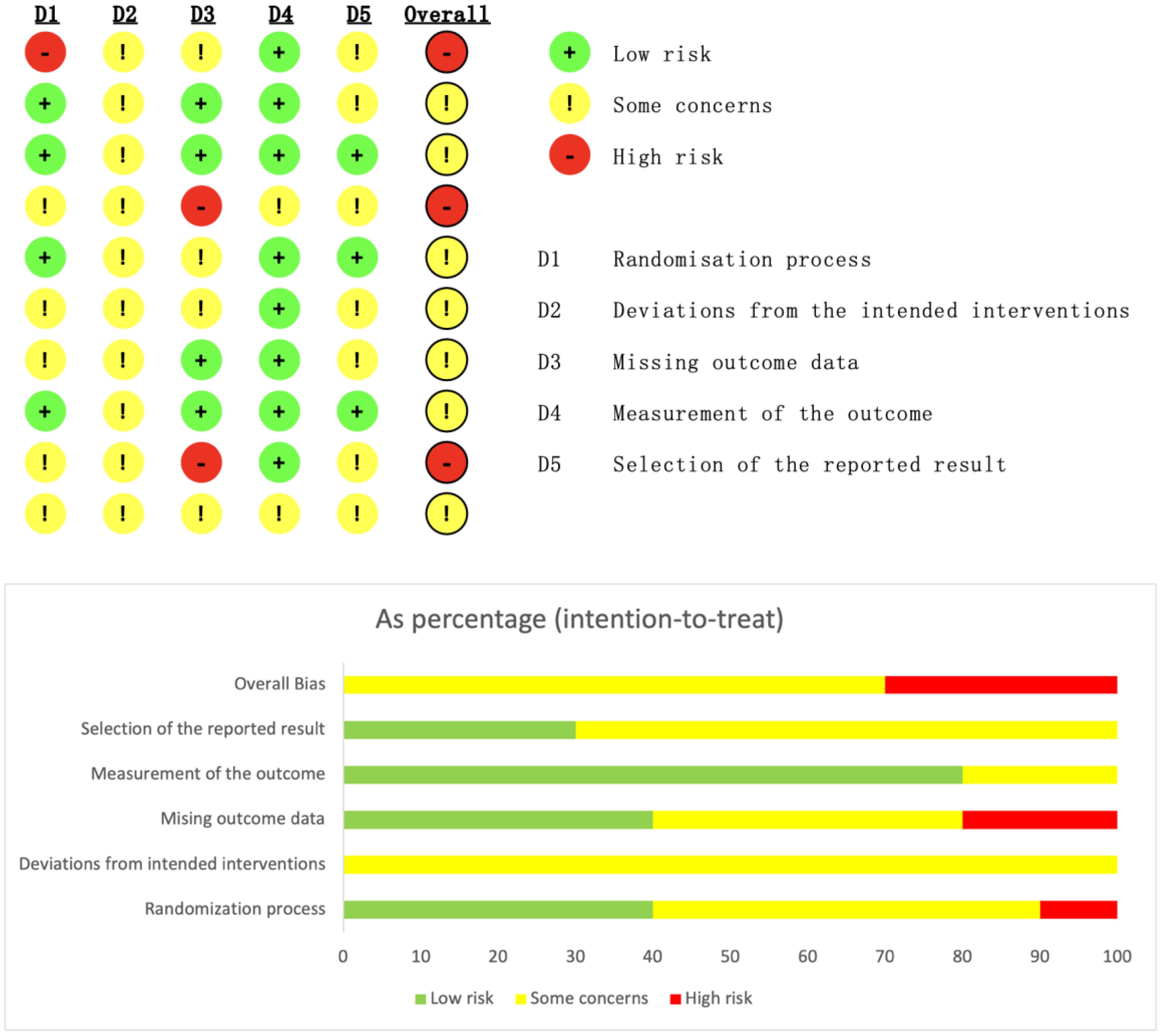 The methodological quality of the included studies was assessed independently by two researchers using the Cochrane Risk of Bias Tool (RoB 2.0) (10). This tool evaluates the following five domains: (1) randomization process; (2) deviations from intended interventions; (3) missing outcome data; (4) outcome measurement; and (5) selective reporting of results. Each domain was judged as “low risk,” “some concerns,” or “high risk.” The overall risk of bias was determined based on the most severe rating across the domains. Two researchers independently conducted the assessments, and any disagreements were resolved through discussion or consultation with a third researcher.