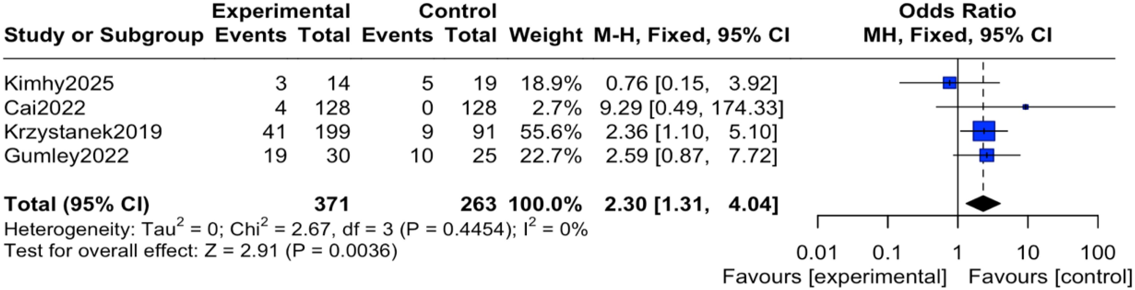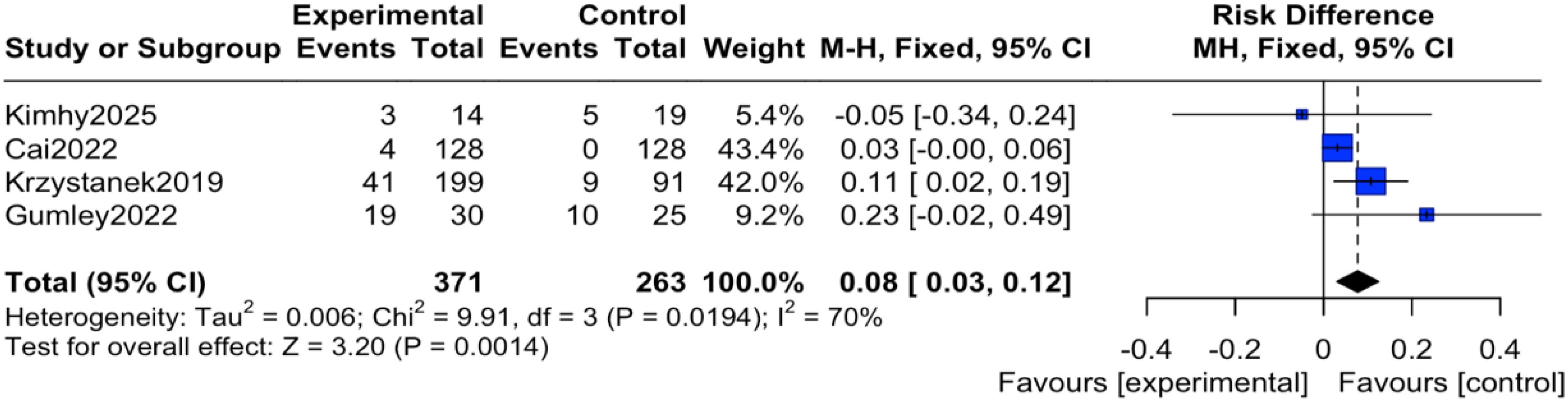 The reported events across these trials encompassed a range of outcomes. For instance, study (12) reported transient anxiety and sleep disturbances related to the exercise intervention; study (14) noted mild somatic discomfort; study (16) included events such as headache and agitation; and study (19) reported more serious events including hospitalization for psychiatric relapse. It is important to note that none of the studies documented adverse events directly attributable to the digital device or application itself (e.g., eye strain, digital-specific anxiety). Regarding the pooled analysis, there was no heterogeneity among the studies (I² = 0%, P = 0.45), therefore an inverse-variance fixed-effect (IV, Fixed) model was applied. The results indicated that the reported incidence of adverse events was significantly higher in the intervention group compared to the control group, with the difference being statistically significant (OR = 2.30, 95% CI = 1.31 to 4.04, P = 0.004), as shown in Figure 4. To express this risk in absolute terms, the risk difference (RD) was 0.08 (95% CI 0.03 to 0.12), indicating an absolute increase in risk of 8% in the mHealth group, as shown in Figure 5.