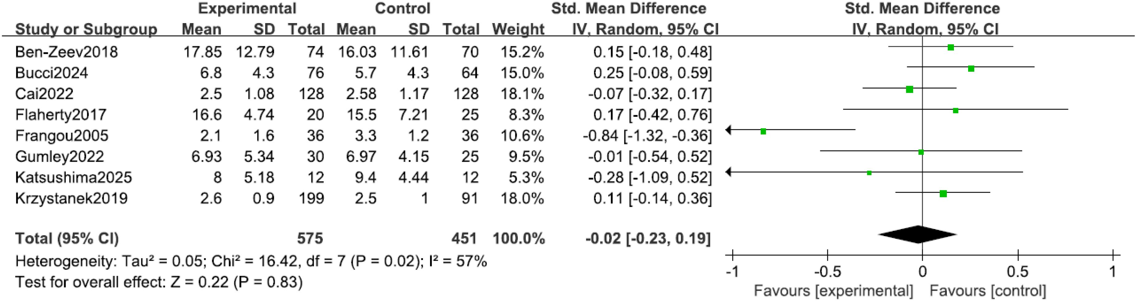 Eight studies (9, 13, 14, 16–20) reported depressive symptoms in patients, with significant heterogeneity among the studies (I² = 57%, P = 0.02). Sensitivity analysis did not identify a clear source for this heterogeneity; consequently, an inverse-variance random-effects (IV, Random) model was adopted to provide a more conservative estimate of the effect. The results indicated no statistically significant difference in depressive symptoms between the two groups (SMD = -0.02, 95% CI = -0.23 to 0.19, P = 0.83), noting that a negative SMD would indicate improvement, as shown in Figure 6.