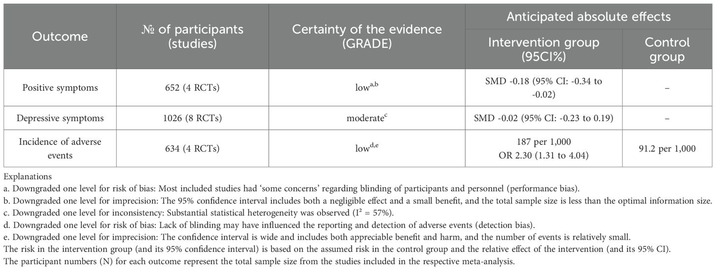 For the three primary outcomes of this review (positive symptoms, incidence of adverse events, depressive symptoms), we will use the Grading of Recommendations Assessment, Development and Evaluation (GRADE) approach to assess the certainty of evidence (11). The GRADE assessment starts with high certainty for randomized trials and may be downgraded based on five domains: risk of bias, inconsistency, indirectness, imprecision, and publication bias. The certainty of evidence will be categorized as high, moderate, low, or very low.