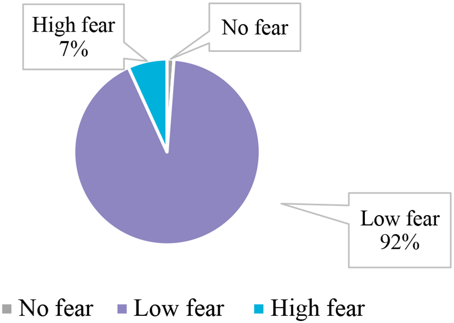 Fear of childbirth was assessed based on the Arabic version of the W-DEQ Wijma Delivery Expectancy/Experience Questionnaire (W-DEQ), which has 10 questions based on the original 33-item version (13). Each item reflects cognitive and emotional expectations about labor and birth (such as perceived control, safety, and anticipated pain). Items are scored on a 3-point Likert scale from 1 to 3, producing a total score between 10 and 30, with higher scores indicating greater fear of childbirth. The Arabic 10-item version was previously used among pregnant women in Egypt and showed good internal consistency, supporting its use in Arabic-speaking antenatal populations (11). In line with that study, and to facilitate comparison, we categorized W-DEQ scores into three groups: no fear (score of 10), low fear (scores 11-20), and high fear (scores >20). Although the short form has demonstrated acceptable internal consistency, detailed psychometric evaluation in Saudi pregnant women is still limited, and this should be considered when interpreting the findings.