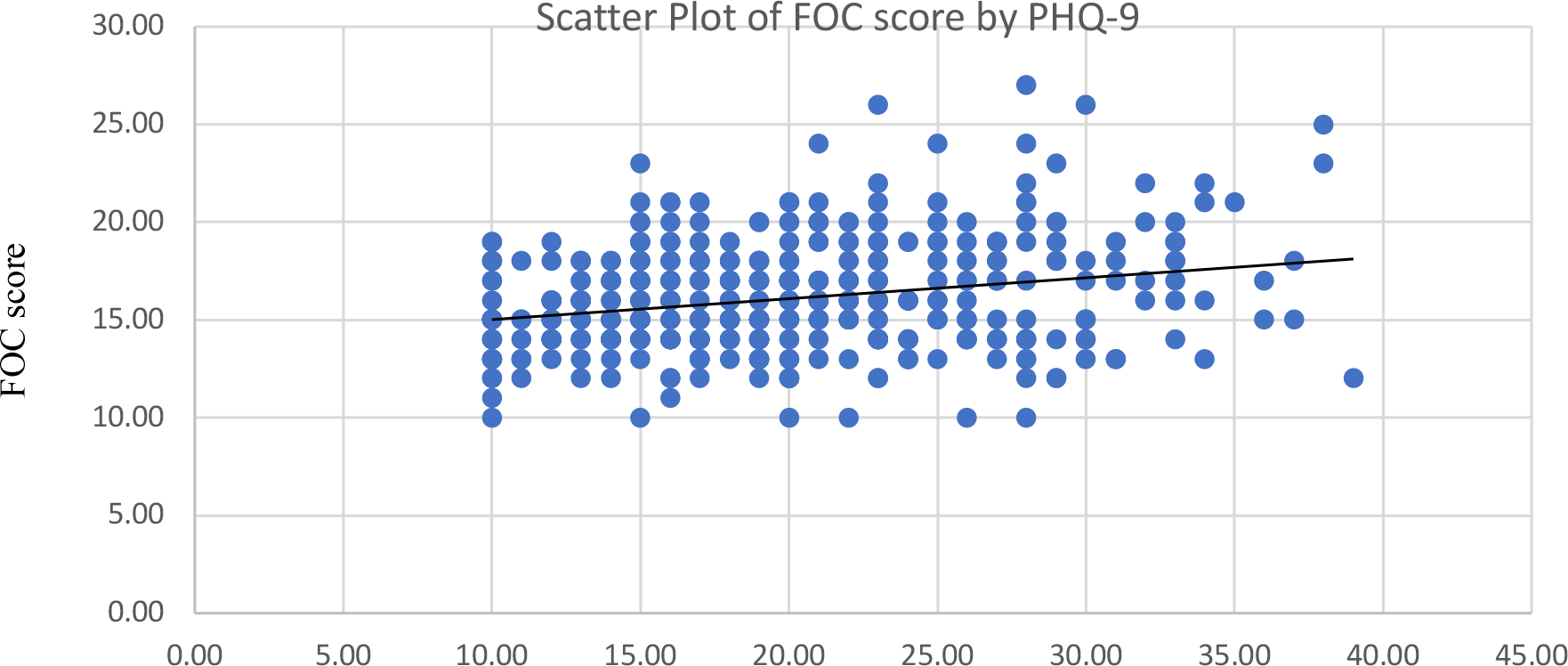 The prevalence of high FOC was 7%. Significant associations were found between FOC and many variables, including low income (p=0.001), unstable marital relationships (p=0.001), first-trimester gestational age (p=0.04), lack of follow-up with pregnancy (p=0.001), and following up in both private and government hospitals (p=0.02). There was a weak positive correlation between FOC and anxiety, as well as depressive symptoms.