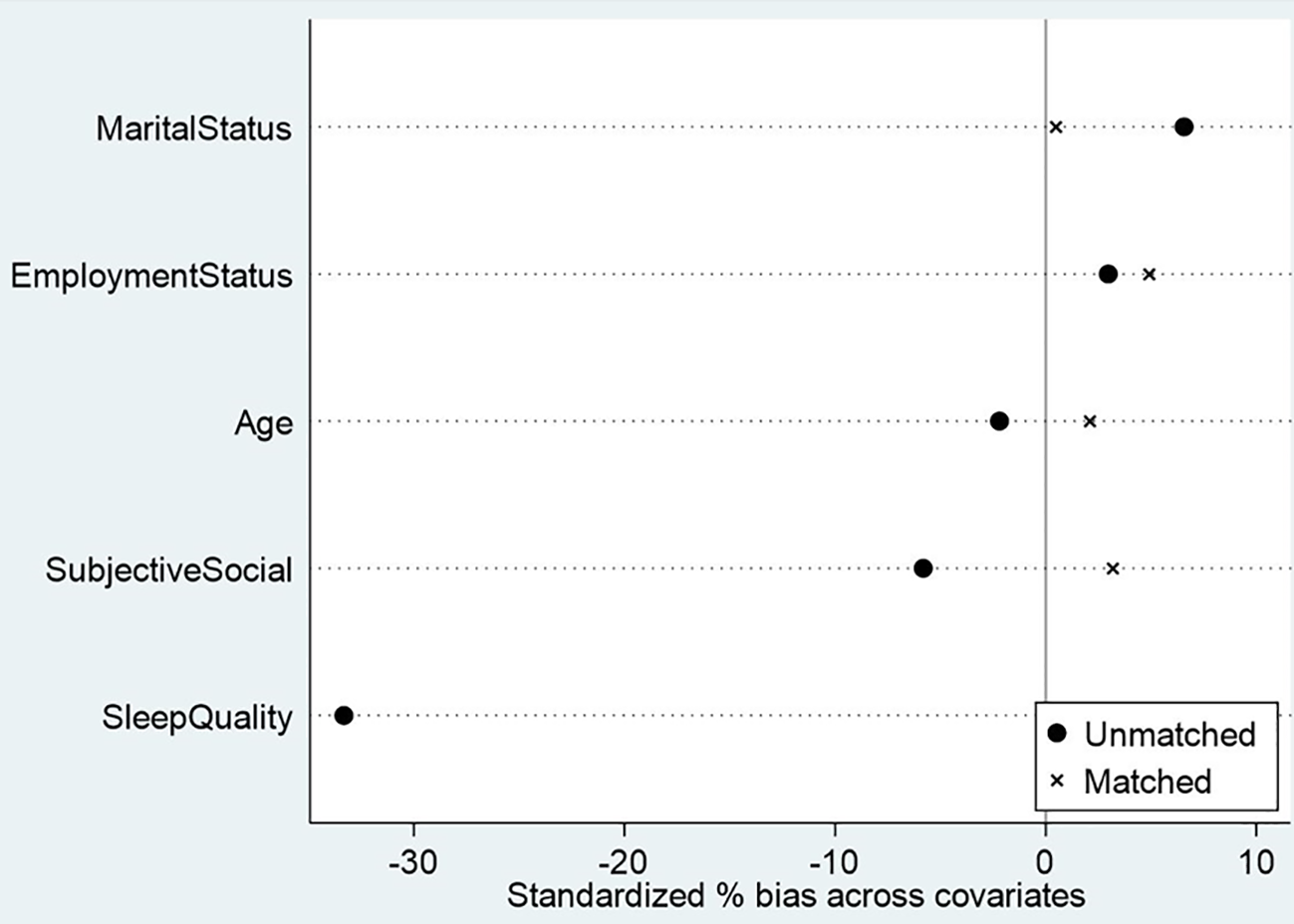 Several limitations of this study warrant consideration. First, the cross-sectional design precludes strong causal inference. Although PSM reduces observed confounding and substantially improved covariate balance (see Figures 1, 2), the study remains observational, and unmeasured confounding cannot be excluded.