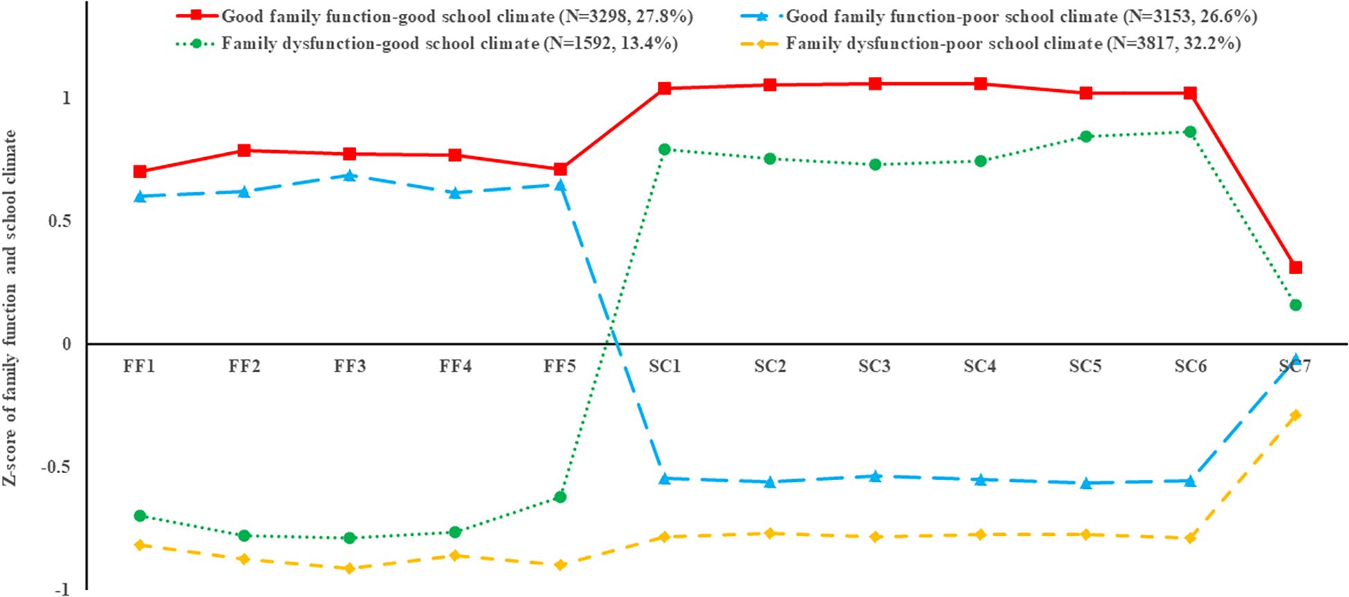 Four latent profiles of family-school environment are shown in Figure 1. The four profiles were as follows (1): good family function-good school climate group (Profile 1; 27.8%, N = 3298), characterized by the highest scores on family function and school climate (2); good family function-poor school climate group (Profile 2; 26.6%, N = 3153), characterized by having high-average scores on family function and low-average scores on school climate (3); family dysfunction-good school climate group (Profile 3; 13.4%, N = 1592), characterized by low-average scores on family function and high-average scores on school climate (4); family dysfunction-poor school climate group (Profile 4; 32.2%, N = 3817), characterized by the lowest scores on family function and school climate. Descriptive statistics of family function, school climate, resilience, and depressive symptoms in different family-school environment profiles were illustrated in Table 3.