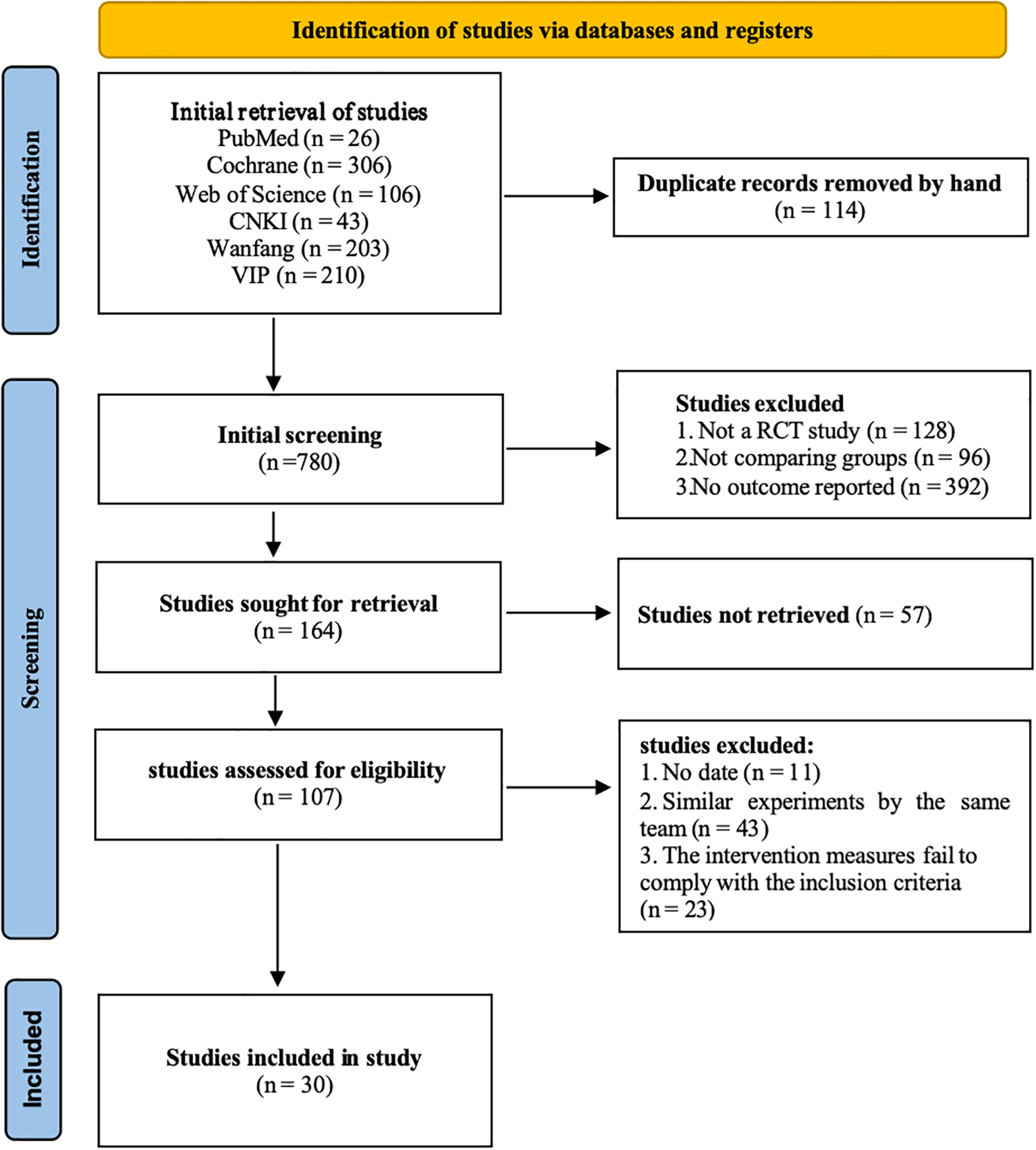 A total of 894 relevant studies were retrieved, among which 456 were in Chinese and 438 were in English. After manually eliminating 114 duplicates, 780 were incorporated. After reading the titles and abstracts and excluding those not meeting the inclusion criteria, 164 were eligible. After excluding those for which the original text could not be obtained even after contacting the authors and relevant institutions, 107 were included. After reading the full texts and excluding similar studies conducted by the same research team and those with intervention measures that did not conform to the inclusion criteria, 30 were ultimately eligible (Figure 2).