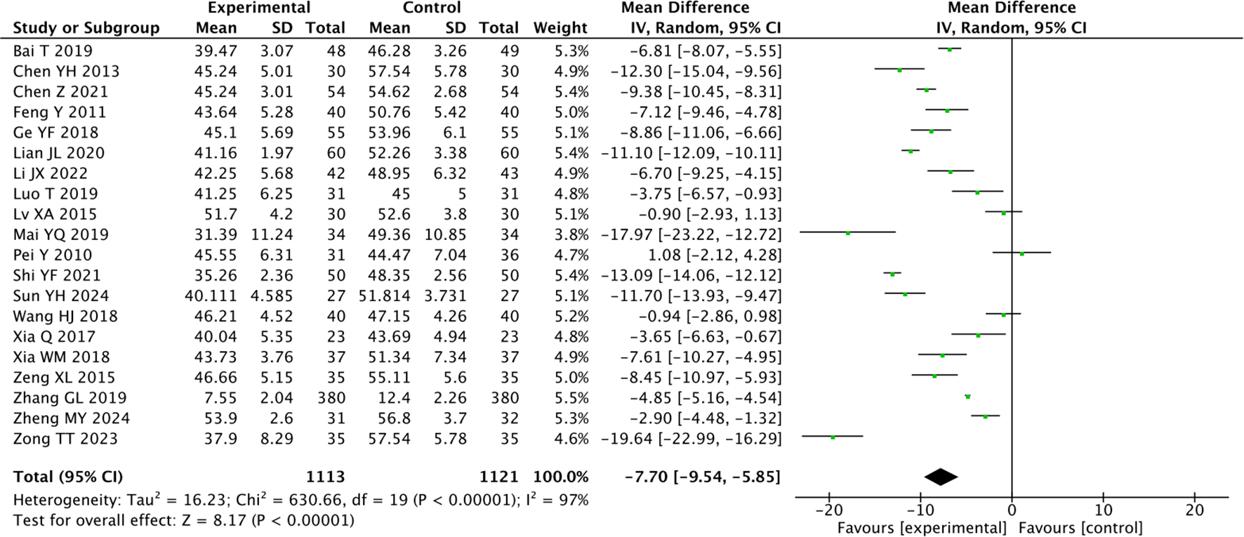 Among the 20 articles that reported SDS scores, the heterogeneity was large ({it}I{sp}2{/it} {/sp}= 97%), so the random-effects model was used. A total of 2234 patients were enrolled, including 1113 patients in the experimental group and 1121 patients in the control group. The results showed that traditional Chinese acupuncture-related therapies could be used as an adjunct to drugs in the treatment of CRD (MD = -7.70, 95% CI -9.54, -5.85; P < 0.00001, Figure 4).