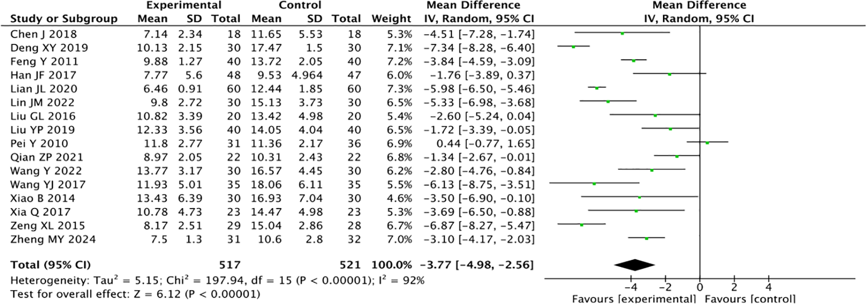 Acupuncture combined with medication was superior to medication alone (MD = -6.17, P < 0.00001). Moxibustion combined with medication was superior to medication alone (MD = -8.84, P < 0.00001). Acupoint application and pressing combined with drug therapy were superior to drug therapy alone (MD = -4.84, P < 0.00001). Auricular acupressure combined with drug therapy was superior to drug therapy alone (MD = -7.68, P = 0.006, Table 3).