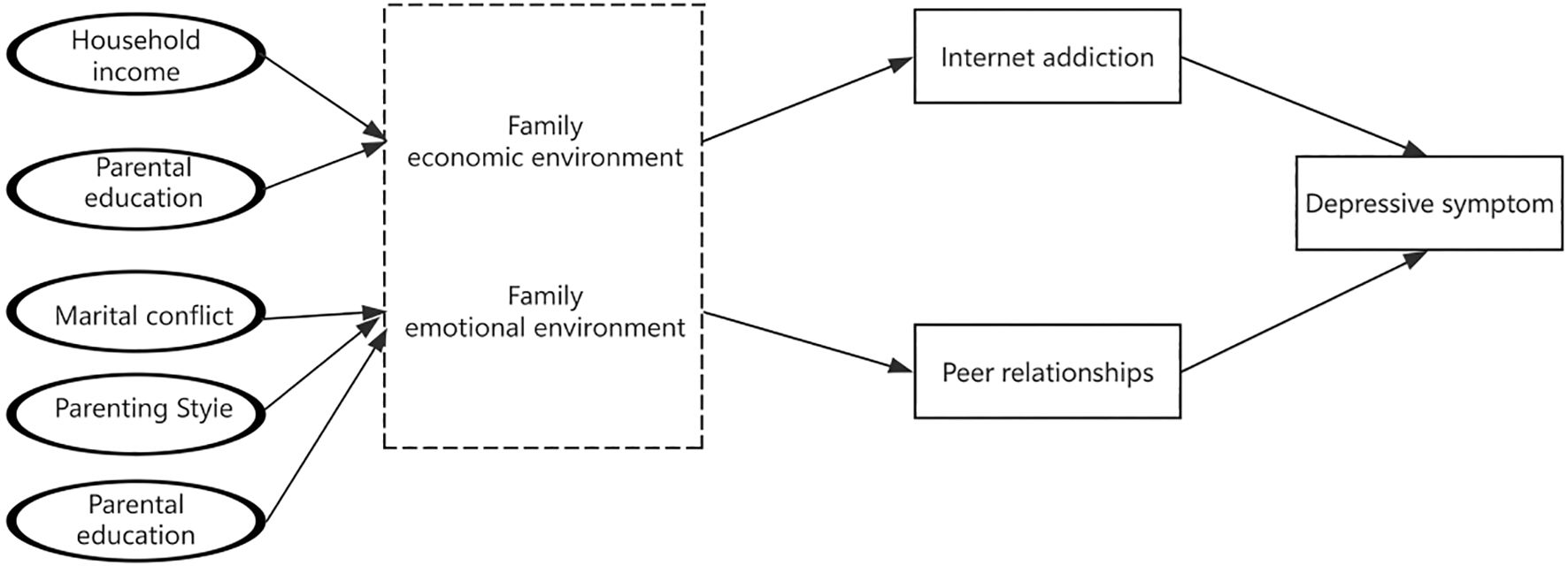 Hypothesis 2b. The influence of family economic environment on adolescent depressive symptoms is mediated by internet addiction and peer relationships.