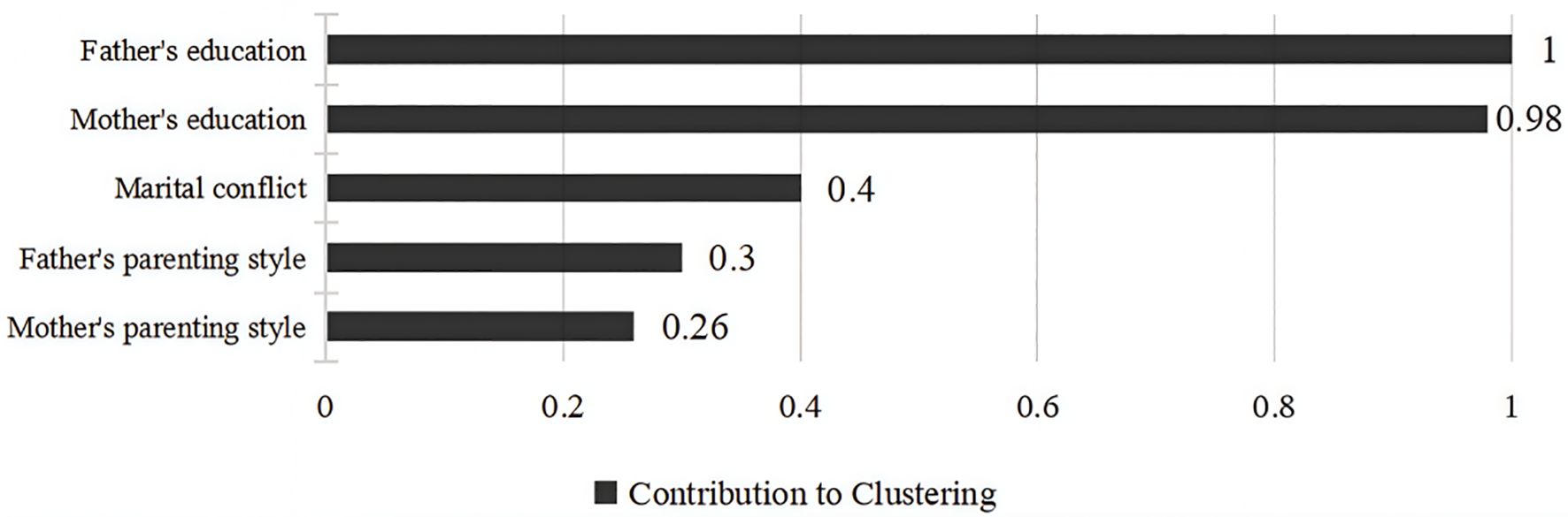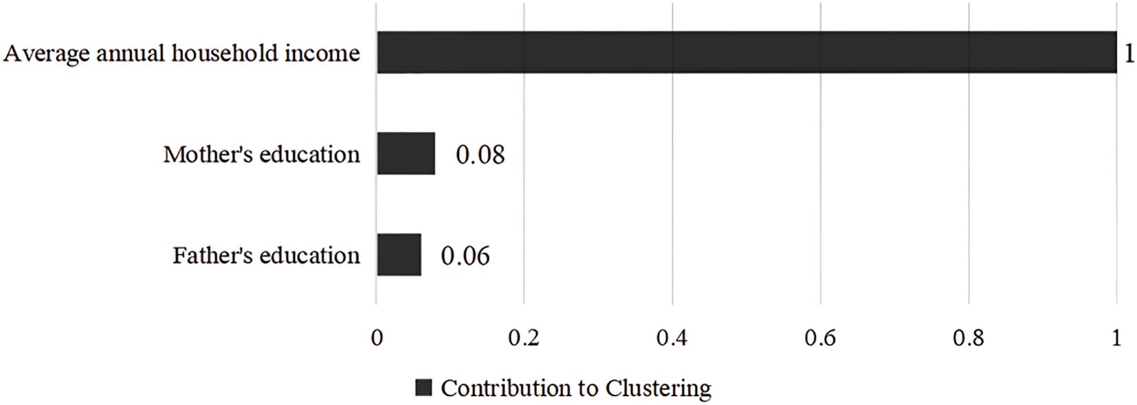 The clustering profile measure was 0.4, indicating that the quality of this clustering was fair. According to the BIC quasi-test, the optimal number of clusters for the family economic environment was 2 categories, the first category is high family socioeconomic status (SES), a total of 800 (28.7%), family resources are more abundant, and the second category is low family socioeconomic status, a total of 1,985 (71.3%), the family resources are more scarce, see Figure 4. The contribution of the three variables to the clustering is shown in Figure 5, with “average annual household income” contributing the most and “father’s education” contributing the least.