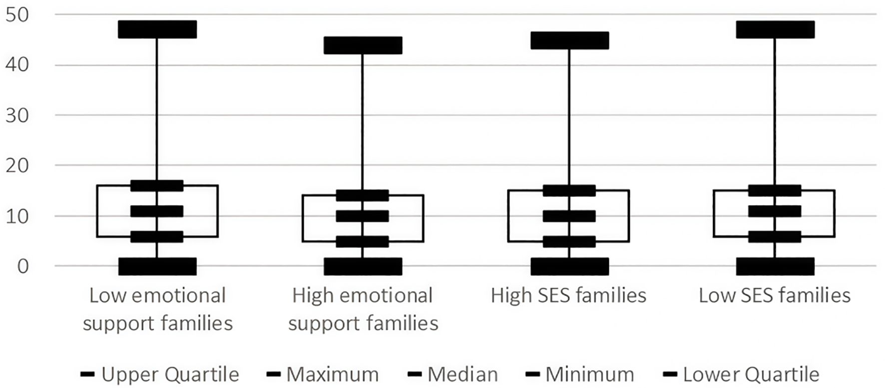 Figure 6 displays the depressive symptom distribution patterns in family emotional and economic environments. As shown, the distribution of depressive symptoms was more concentrated and had a lower median in families with higher emotional support, while the distribution of depressive symptoms was more dispersed and had a higher median for families with low emotional support, suggesting that emotional support may have a significant effect on the severity and distribution of depressive symptoms. The distribution of depressive symptoms was more concentrated and had a lower median in high SES families, while the distribution of depressive symptoms was more dispersed and had a higher median in low SES families, suggesting that SES may have a significant effect on the severity and distribution of depressive symptoms.