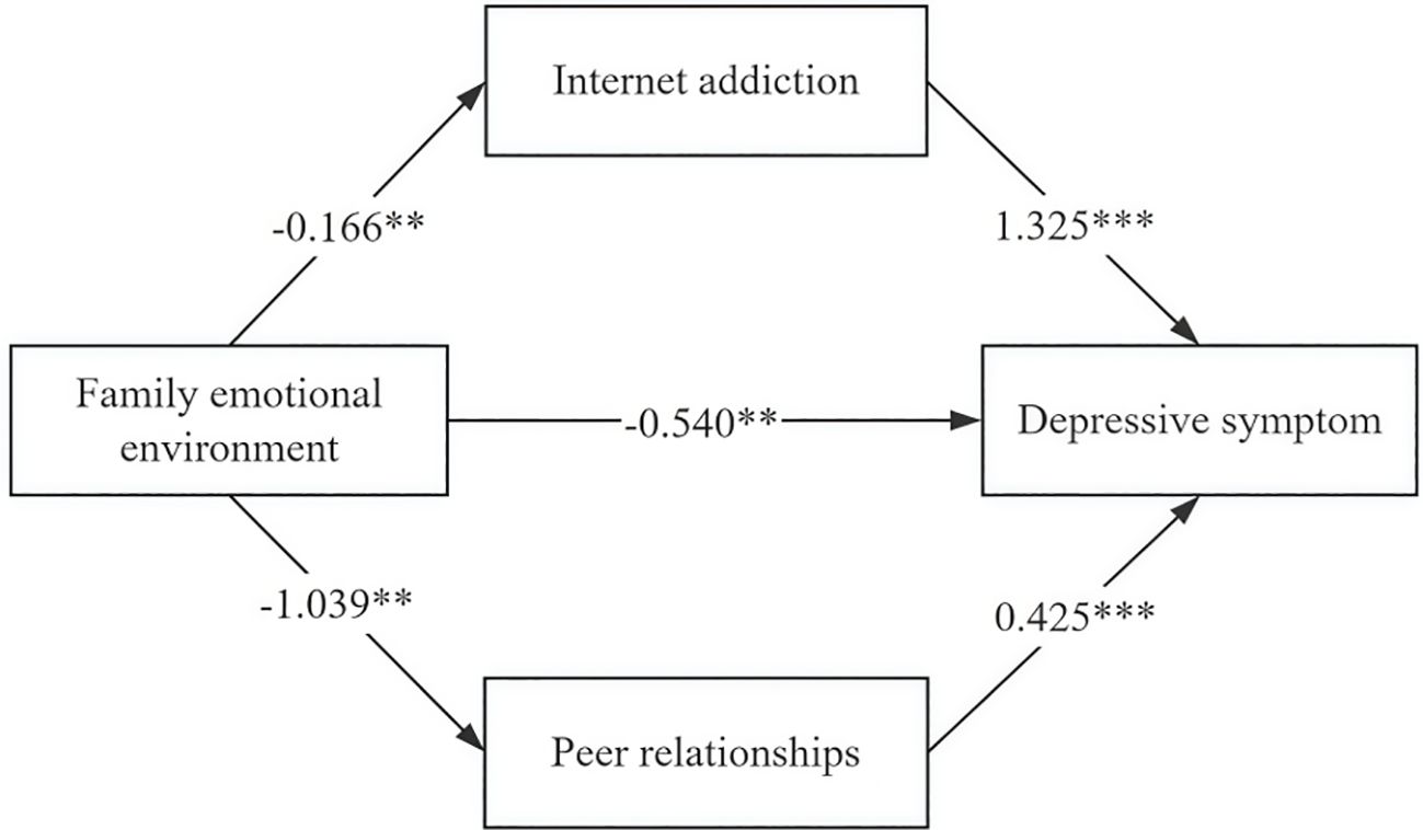Figure 7. Parallel mediating model of family emotional environment, depressive symptoms, internet addiction, and peer relationships. (*** indicates P < 0.001, ** indicates P < 0.01).