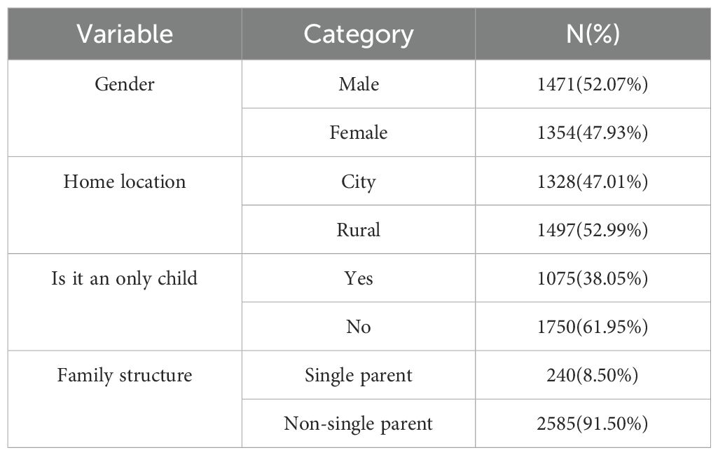 As shown in Table 1, this study included a total of 2,825 adolescents, including 1,471 males and 1,354 females. Among them, 1,328 were from urban areas and 1,597 were from rural areas. In terms of being an only child, 1,075 (38.05%) were only children, while 1,750 (61.95%) were not only children. Regarding family structure, 240 (8.50%) came from single-parent families, while 2,585 (91.50%) came from non-single-parent families.